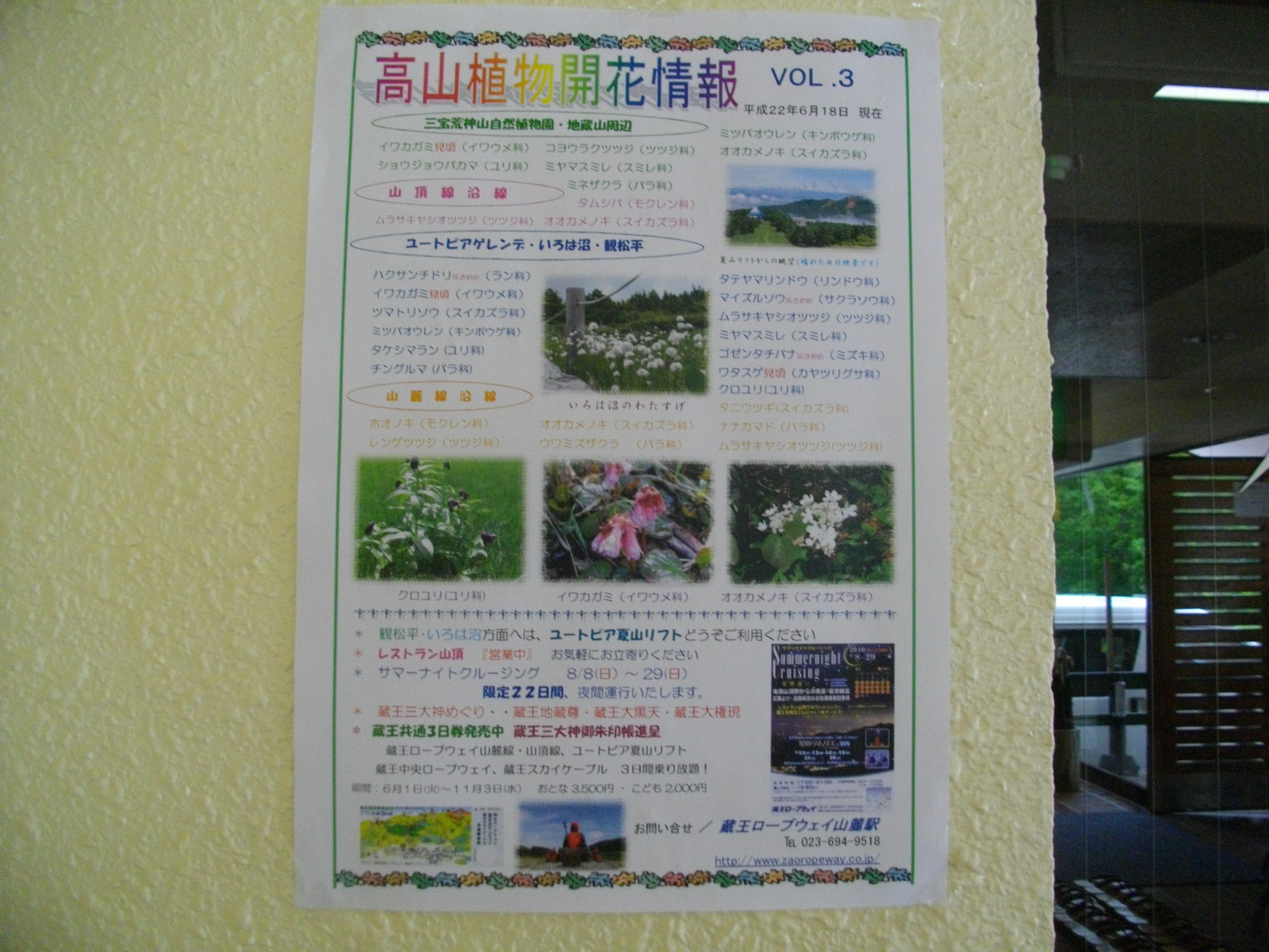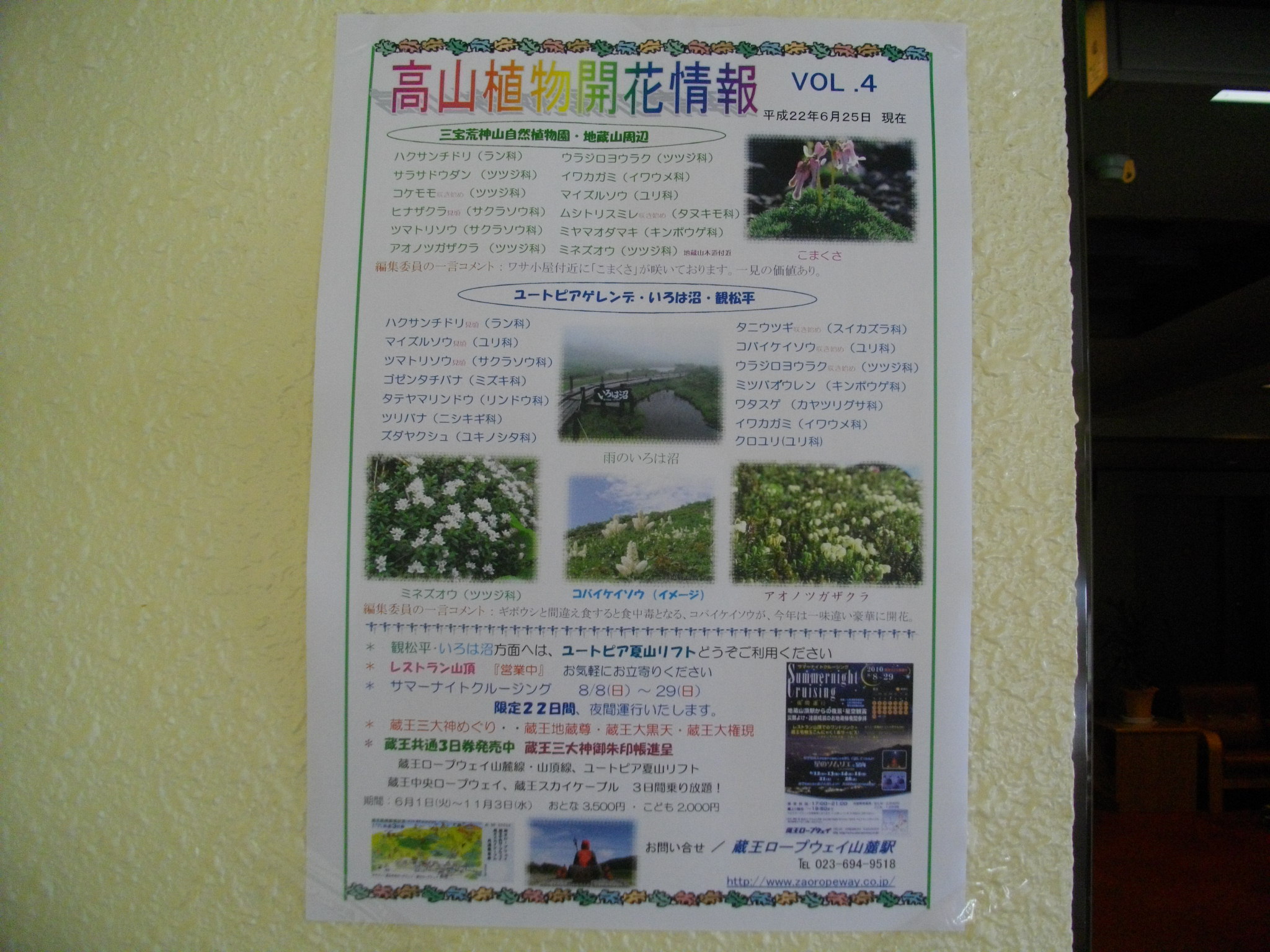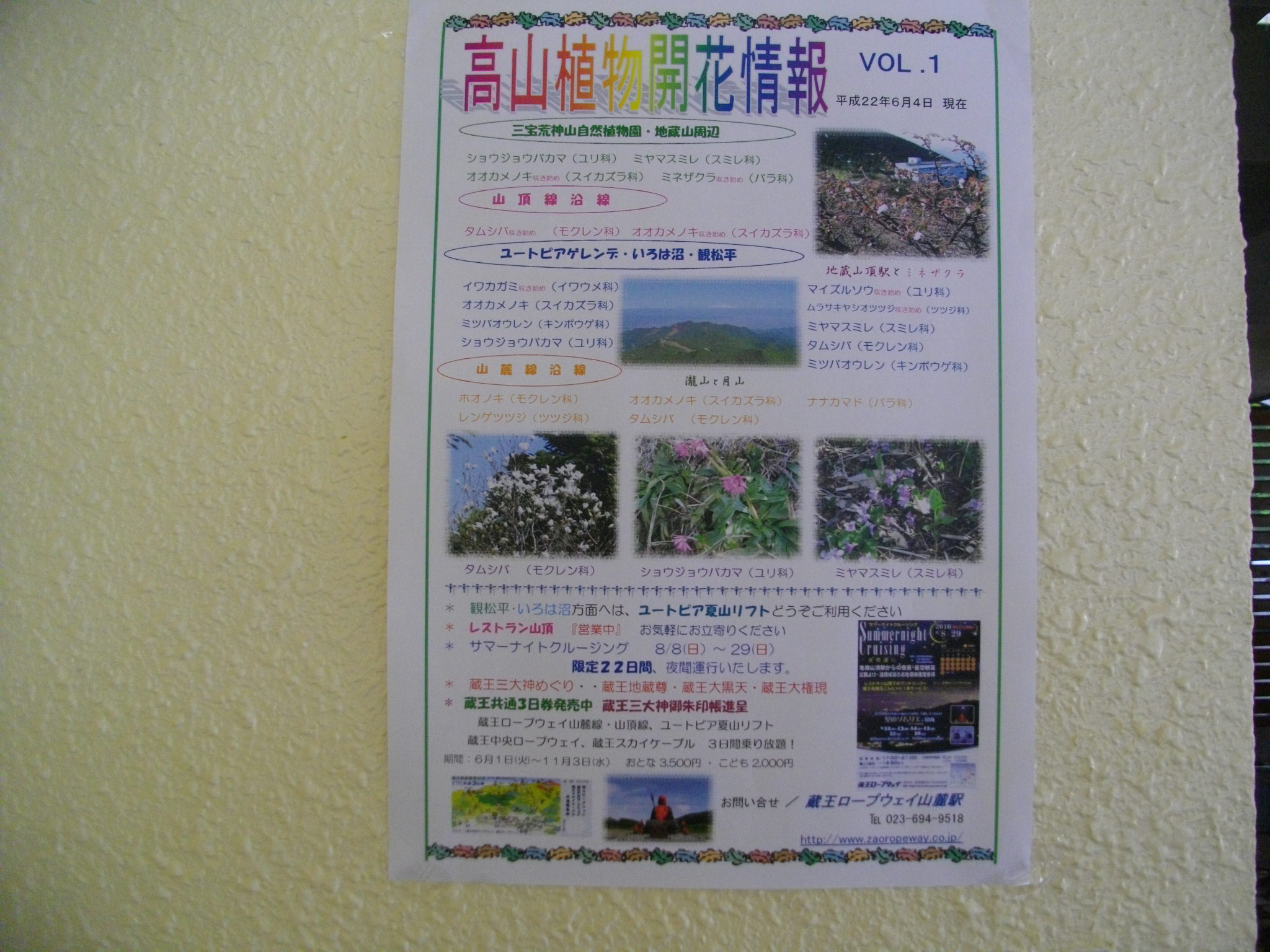 0388de4f.JPGル・ベール蔵王玄関前・朝7時・晴・弱風。例年作成されお客様に好評な高山植物情報がフロントに届きました。写真の蔵王ロープウェイ山麓駅発行「2010年第1回高山植物開花情報」が届きました。蔵王ロープウェイホームページにも掲載されています。当館玄関内に掲示しています。高山植物観賞に最適の地蔵山頂駅山頂レストラン昼食付割引パンフレット(3900円⇒2,800円)・ロープウェイ割引パンフレット(2,900円⇒2,000円)及び蔵王山・蔵王三大神めぐり3日間ロープウェイ・スカイケーブル乗り放題のパンフレット(3,500円・御朱印帳付)がフロントにございます。
