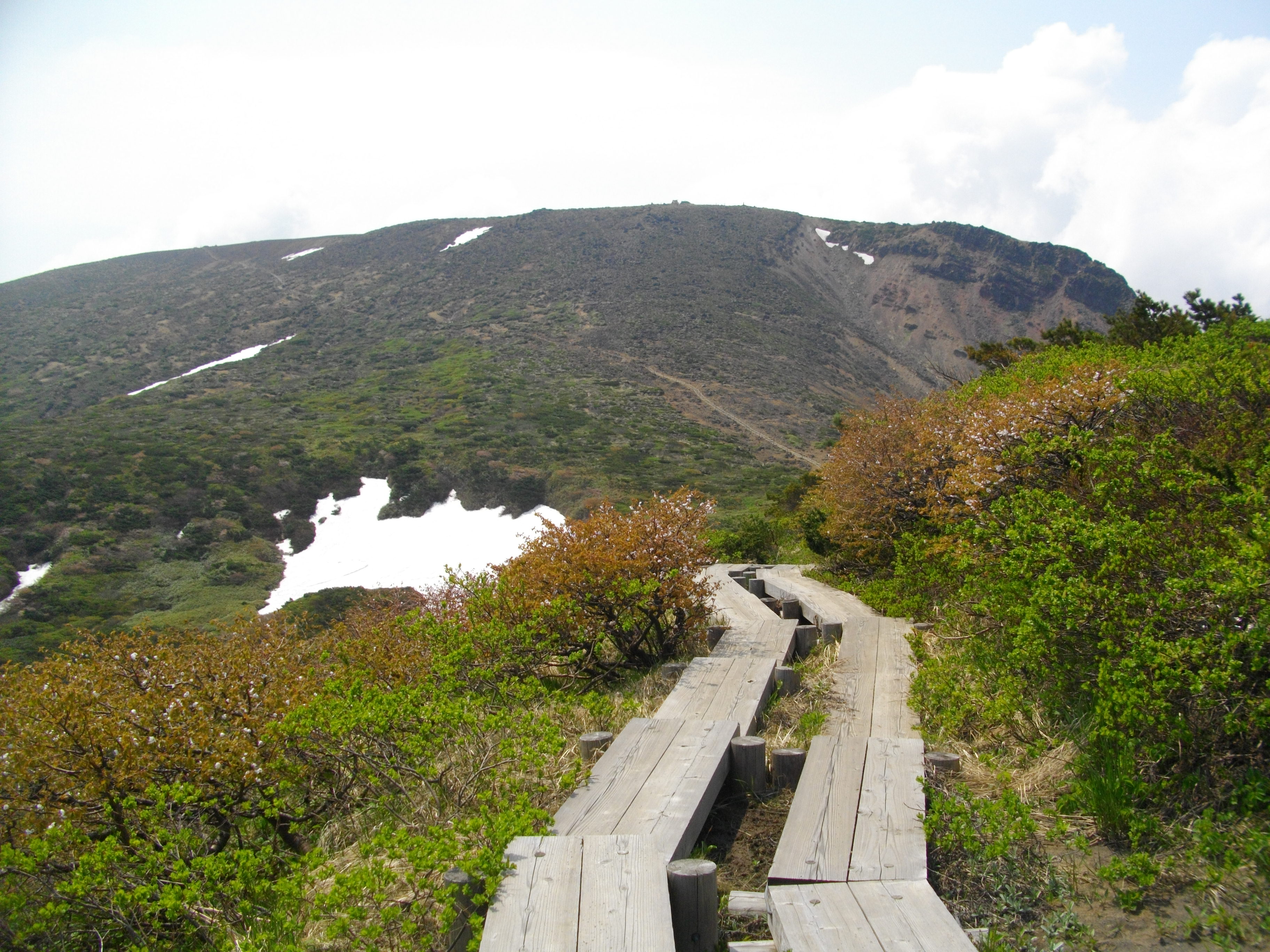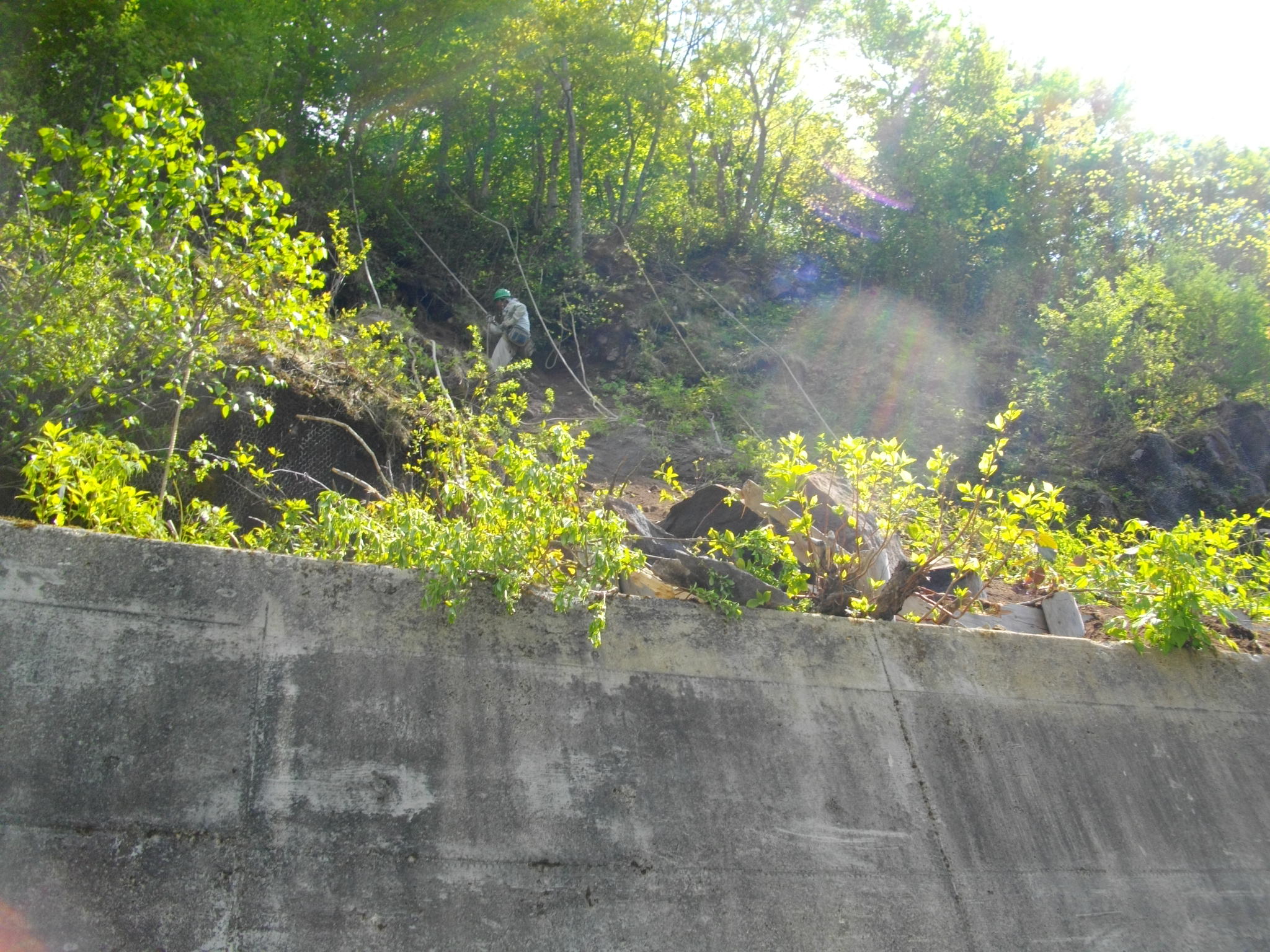 c18af106.JPGル・ベール蔵王玄関前・朝7時・12度・晴・弱風。今日始めて祓川登山道に蔵王林道から行ってきました。蔵王林道はは6月19日迄蔵王ラインから蔵王林道通行禁止です。写真は今日落石の斜面の浮石を工事作業者が林道に落としている所です。この場所手前まで車で送ってもらい林道を祓川登山道口まで歩きました。祓川登山道水浸しで足元がグジャグジャの所が数箇所あります足首まで水浸しになります。登山道両側ツツジが綺麗でした。倒木が2ケ所有り鉄橋する必要があります。新緑が美しく虫も少なく快適なトレッキングでした。19日までは蔵王ロープウェイ山麓線⇒ユートピア夏山リフト⇒菖蒲沼ゲレンデ方面連絡コース⇒祓川登山道のコースが手軽にトレッキングに良いようですリフト上(標高1.420m)から約90分で中森ゲレンデ登山道口(標高900m)へ降りれます。二度川橋2ヶ所板を剥がして危険箇所を教えています。端から15m上4年前雪融けで階段崩落した所更に土砂崩れしました。一日も早い復旧が