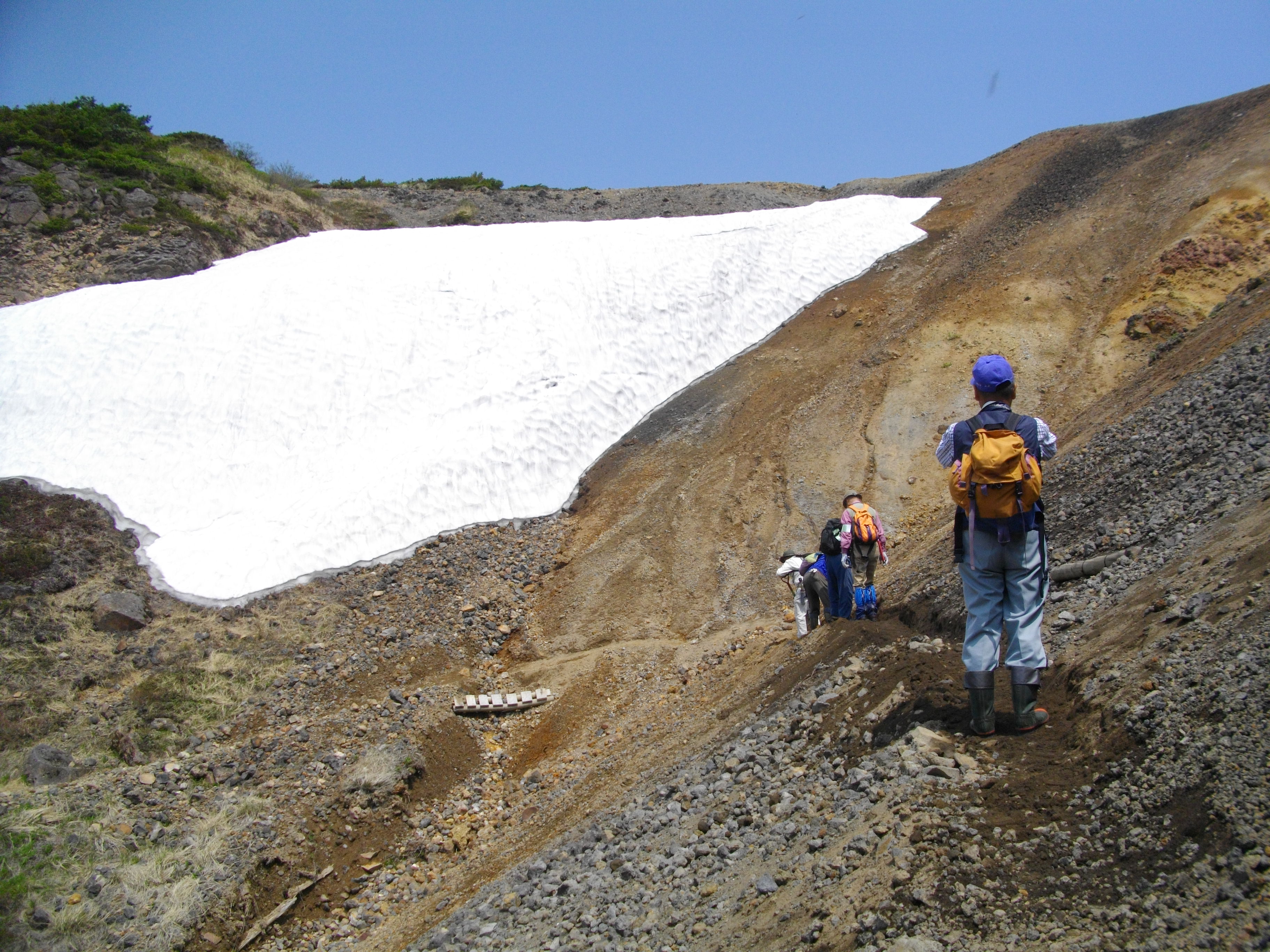 73fd0735.JPGル・ベール蔵王玄関前・朝7時・晴・中風。蔵王ロープウェイ山麓駅9時発のゴンドラで蔵王パークボランティア祓川登山道整備活動に参加しました。鈴木自然公園管理員+ボランティア5名合計6名です。同じゴンドラにNHK登山教室10名も一緒でした。地蔵山木道残雪消えました。両側のミネザクラ満開でした。熊野岳の北側蔵王沢まだ数箇所残雪が残っていました。和三小屋跡から祓川登山道に行きました。写真は地蔵山からの土石流で例年登山道が崩落する沢です。今年は登山道を整備するだけでした。登山道の途中側溝土砂で埋まり平になった所が10ヶ所ありシャベルで土砂を出した。登山道破損ほとんど無く昨シーズンの積雪が少なかった為と思われます。御田之神様下の分岐点自然植物の看板倒れていたので立てました。いろは沼2週間前全面水におおわれて全面水面で一つの湖水でしたが水位が下がり沢山の沼が出来上がり本来のいろは沼が出現していました。ユートピア夏山リフト両側コブシ・オオカメノキが満開でした。