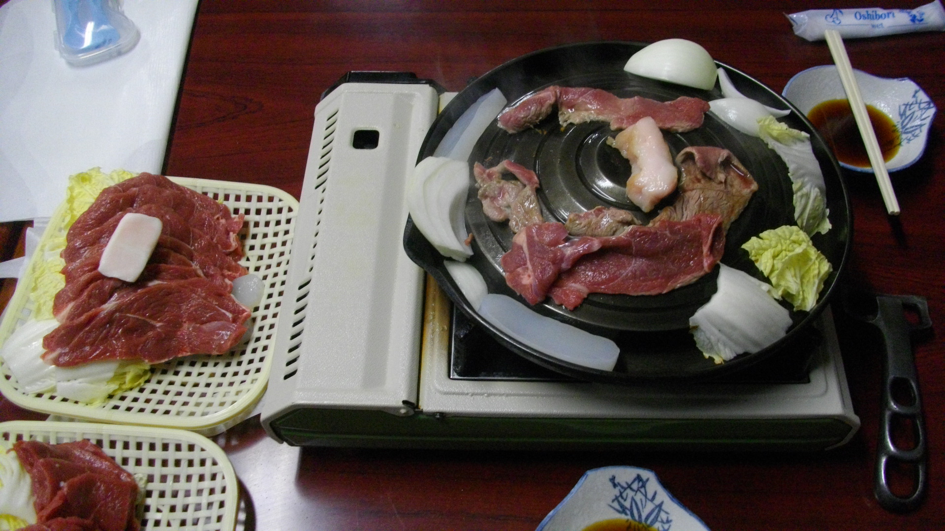 c12e88fe.jpgル・ベール蔵王玄関前・朝7時・19度・曇・強風。昨夜は大雨で蔵王温泉バスターミナル前の菊地食堂までジンギスカンを食べに行きましたがびしょびしょのぬれねずみ状態でした。菊地食堂のジンギスカンは肩ロース・モモ・ミックスの三種類があり肉だけをいつも2人前注文します。写真はモモをジンギスカン鍋で焼いているところです。油も少なくヘルシーな肉料理です。数件ジンギスカンが食べれますが蔵王河童一番のおすすめの店です。手打ち蕎麦の冷たい肉蕎麦も山形市内蕎麦屋さんより美味しく造ってくれます。