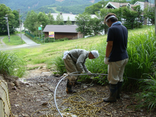 湯管に虎ロープを通し湯管の湯花を落とす作業です。