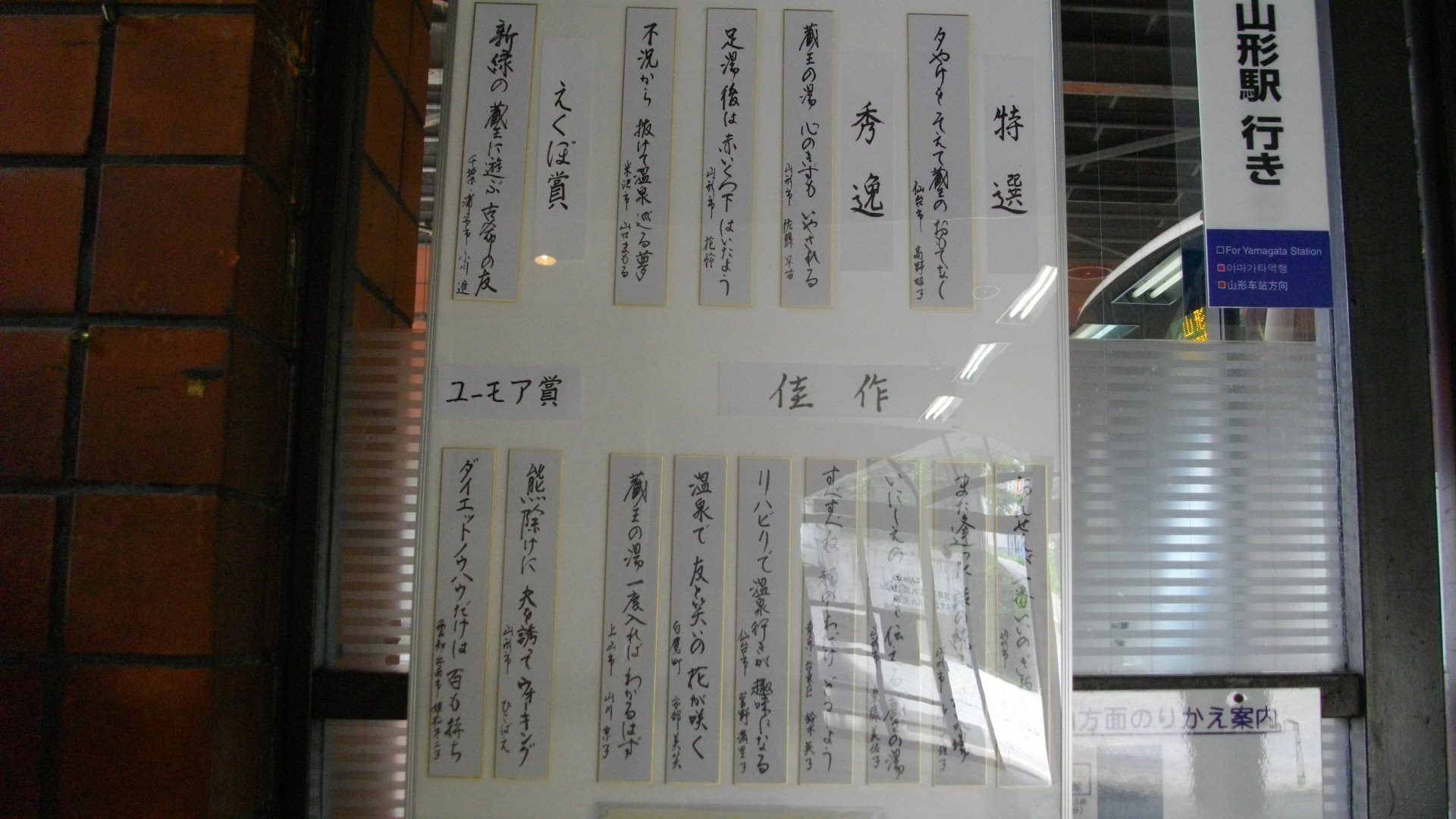 296ac743.jpgル・ベール蔵王玄関前・朝7時・18度・曇・中風。おらえのとっておき祭6月30日終了し川柳投句作品が蔵王温泉バスターミナルに掲示されました。当館女将の句は高湯通り奥酢川温泉神社階段を川柳坂として両側の石灯篭に掲示されています。写真はバス乗車口左側に特選他右側に入選作が掲示されています。特選「夕やけをそえて蔵王のおもてなし」は仙台市高野さんの投句です。蔵王ロープウェイ山麓駅より高山植物開花情報VOL・NO6号7月9日発行が届きました。高山植物の女王「こまくさ」がいよいよ見頃になりました。地蔵山頂駅から往復120分でご覧になれます。