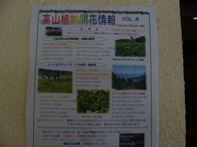 9c7683a8.jpgル・ベール蔵王玄関前・朝7時・21度・曇、夏真っ盛り夏ゼミがうるさく鳴いています。蔵王公園線百日紅の花が咲いています、中森道路の公庫蔵王寮には合歓の木が香りも良く咲いています。蔵王ロープウェイ山麓駅発行高山植物開花情報VOL9号7月30日が届きました。ユートピア・樹氷高原地帯が10種類を超える花が見頃です。蔵王公園線上野十字路のデジタル温度計故障し電源を切り数週間たちますが修理が終わらないようです。昨日までのツーデーマーチのウォーカー半ズボン・半袖の方が半分以上いました。登山道整備の公共予算削減され昨年まで雇われていた整備作業員いなくなりました、歩きにくく気の毒でした。蔵王でトレッキングなさる場合には長ズボン・長袖シャツ・帽子が必要です。ゲレンデを歩く場合は特に気をつけて下さい。(パラダイスゲレンデ・サンライズゲレンデ等)写真は高山植物開花情報VOL9号です。