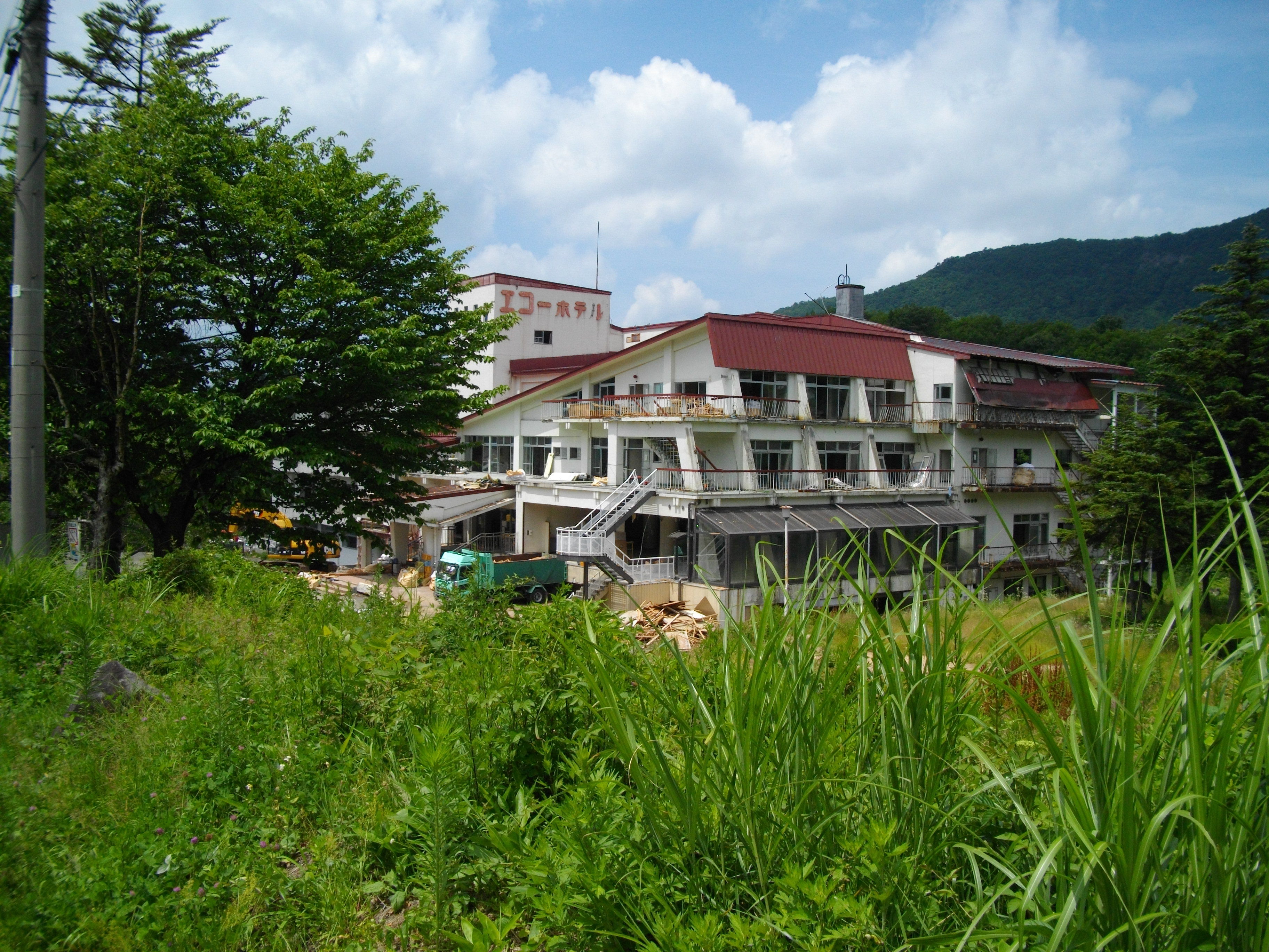 6a47b35f.jpgル・ベール蔵王玄関前・朝7時・21度・晴・ミーミーゼミが鳴き始めました。・強風隣の庭の巨木ゆらゆらゆれています。山百合が隣の庭に満開です。写真は7月20日より11月10日迄解体工事をしている昭和40年代初期に蔵王温泉に本格的なリゾートホテルとして建築された「エコーホテル」の解体工事です。スキーシーズン前に更地になります。(樹氷橋から樹氷通りに来る左側で工事をしています。)パラダイスロッジ・山のホテルに続く3番目の閉鎖されたホテルでした。(山のホテルは近々近江屋さんが改築しオープンさせる予定???)