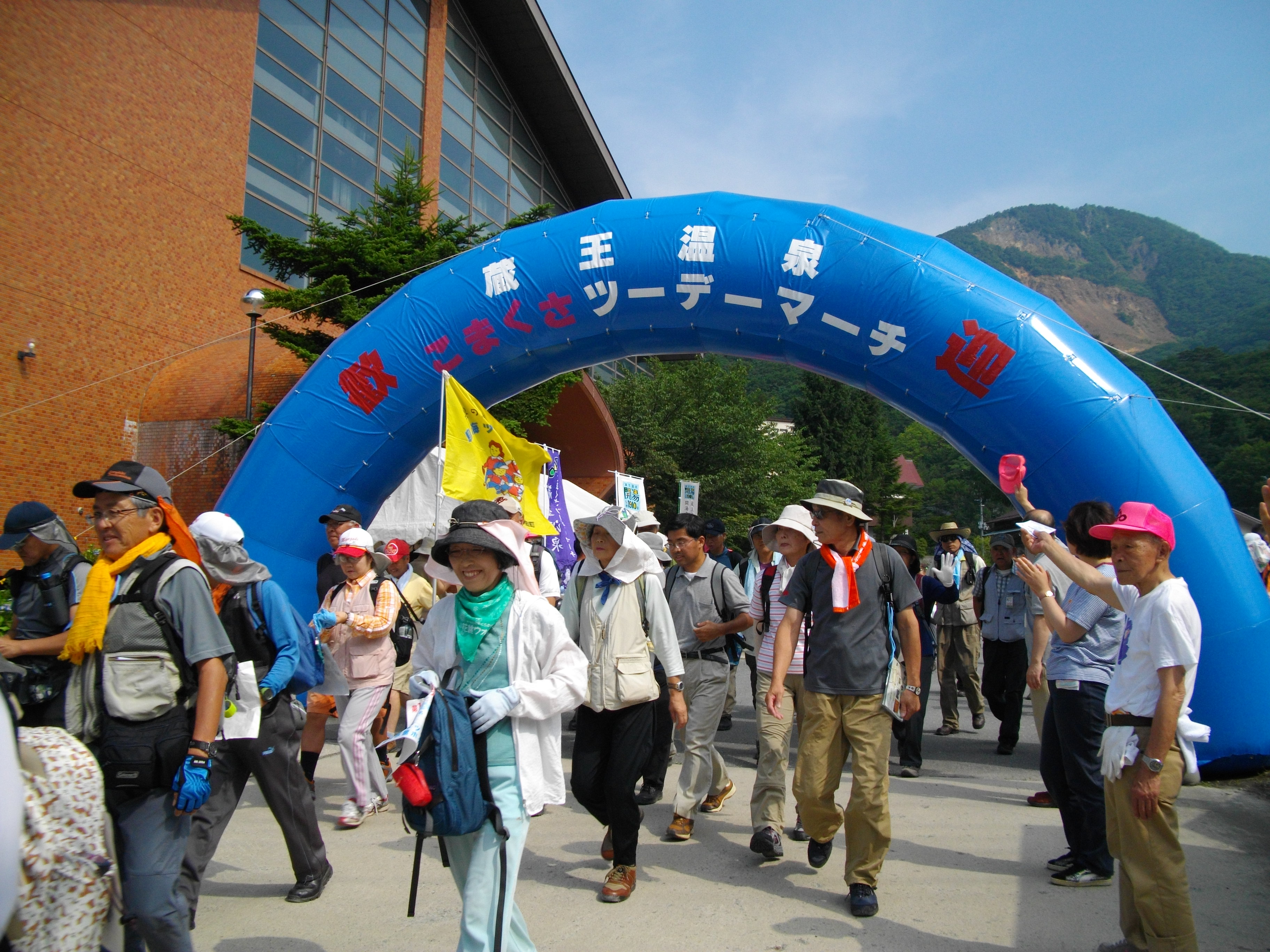 d5b984fe.jpgル・ベール蔵王玄関前・朝7時・20度・曇・弱風・第13回蔵王温泉こまくさツーデーマーチが盛大に行われました。500名弱の参加で一番参加の多いのはSP30Kmでした。写真は蔵王体育館からウォーキングに出発する所です。オリンピックショートトラック3回出場の勅使川原郁恵ゲストウォーカーが挨拶と準備運動の指導をし10Kmコースにも参加した。完走した方に共同浴場入浴券をお渡しした。5Kmコースは20名以下と少なかった。