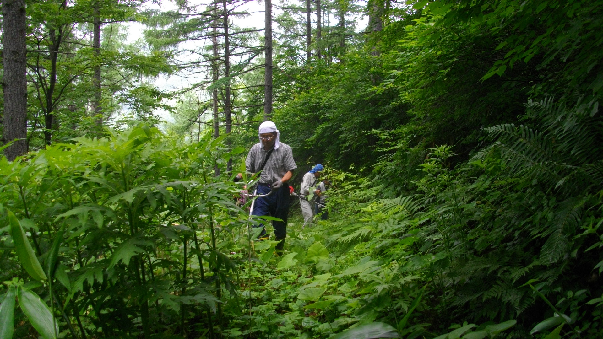 f87d1cb7.jpgル・ベール蔵王玄関前・朝7時・19度・晴・中風。蔵王中央ロープウェイ外装の塗り替え始まりました。蔵王ロープウェイ山麓駅駐車場に鈴木自然公園管理員・蔵王パークボランティア5名が9時に集合、横倉コースからひろはの小径の草刈整備を行ってきました。横倉コース下大森リフトから蔵王ラインまでの下部は蔵王ロープウェイスタッフが先週整備してくれていました。写真は草刈をして整備している所です。横倉山の山頂展望台まで整備しました。横倉の壁方面と大森リフトの間の登山道入口に虎ロープが張られており撤去しました。鈴木管理員より今年のドンデンガラここ数年で一番大きく成長した、百万人ゲレンデは特に大きいと話になりました。