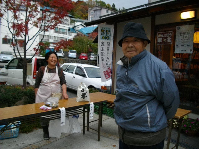 09aef5f9.jpgル・ベール蔵王玄関前・朝7時・13度・曇・弱風・駐車場奥の山の紅葉今日が赤が多くなり見頃です。高湯通りの朝市春から好評でしたが今日が最終日・写真は朝7時農作物完売の池野さんとおくむら(ラーメンが美味しいお店)の90歳長老奥村さんです。おばちゃんの前には新米1袋だけ置かれています。今日朝11時からトニーザイラー記念碑の除幕式がパラダイス片貝沼湖畔で行われます。蔵王中央ロープウェイ明日から11月18日まで整備運休です。11月連休は営業しますお問合せして下さい。山形駅から蔵王山頂行きのバス明日が最終運行です来年ゴールデンウイーク前に再開されます。蔵王エコーライン11月3日17時から来年4月下旬迄閉鎖されます。蔵王お釜見学には蔵王ロープウェイ山頂駅から1時間トレッキングして行けますが出来れば山頂駅に登山届けを出して行って下さい。当然冬の仕度で完全な防寒・防風が必要です。