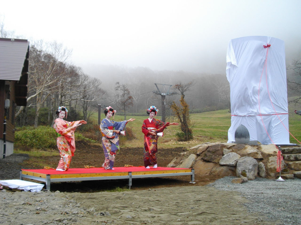 59eaf4aa.jpgル・ベール蔵王玄関前・朝7時・10度・曇標高950m以上濃霧・無風。地蔵山頂駅・朝8時・10度・曇・風速6m・視界良好。写真は昨日パラダイスで行われたトニーザイラー顕彰碑除幕式で山形舞妓8期生(今年4月入社)3名が祝舞を踊っているところです右が顕彰碑です。蔵王ロープウェイ山頂駅からザンゲ坂⇒パラダイスゲレンデを歩くか蔵王中央ロープウェイ鳥兜駅から歩くのと蔵王ラインから山形市林道を車で登る方法があります。11月18日迄今日から蔵王スカイケーブル整備運休です。10月29日30日・11月3日〜6日は営業します。蔵王中央ロープウェイは11月7日より18日迄11月12日13日は営業します。蔵王エコーライン11月3日17時〜2012年4月27日11時迄冬季閉鎖になります。明日10時20分頃より山形の観光大使「ダニエル・カール氏」初のCDになる(蔵王権現からから音頭)の発表会を蔵王二中・三小で行われる文化祭で行います。是非お出でになって下さい。
