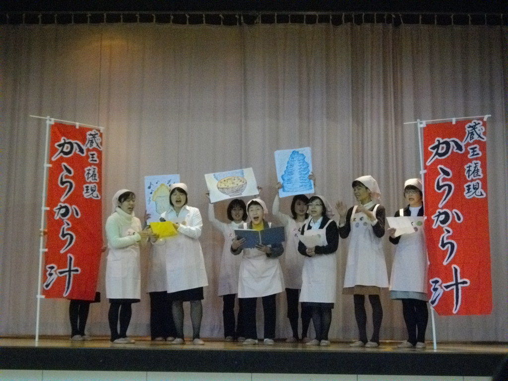6f3cc441.jpg数社のメディアが取材にお出でになりました。ダニエルカールさんのCDに合わせて合唱しました。ダニエルさん始めての歌だそうです。冬の名物料理として旅館・ホテル・食堂等で販売します。からから汁の命名は岡本太郎画伯です。写真はえくぼの会メンバーです。