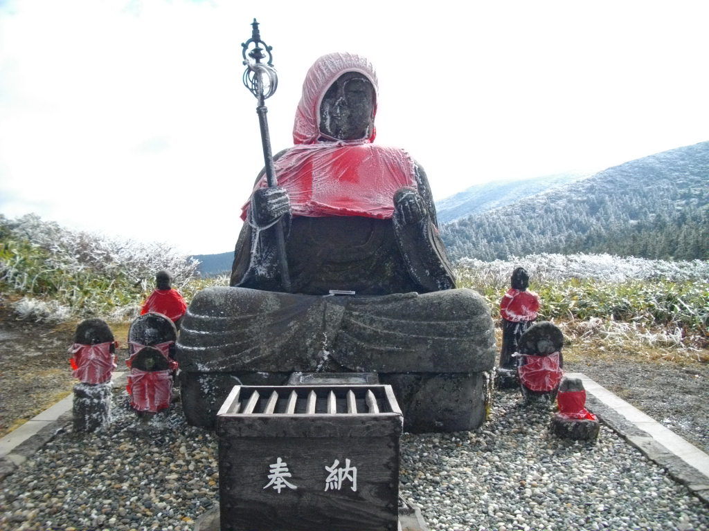 bfa225a9.jpgル・ベール蔵王玄関前・朝7時・15度・雨・強風・蔵王中央ロープウェイウエイト吊下げ定員減で運行。駐車場強風で枯れ葉が沢山落ちました。地蔵山頂駅・朝8時・11度・雨・風速15m強風・視界100m。写真は地蔵山から熊野岳方面登山道途中のワサ小屋前に見つかった頭無の姥神様を春頭部修復の為、山形市石駒運び修理をお願いし、本体に頭部を接続し復元し鎮座された「姥神様」です。6月7日撮影した写真では新製作した頭部白く、おそらく江戸時代に造られた100年前の胴部とアンバランスでしたが、蔵王ロープウェイ最高トップの時代を感じさせるある方法で江戸時代の年代を再現しました。10月10日撮影の江戸時代からの古さを表現した「姥神様」です。蔵王ロープウェイ地蔵山頂駅から約20分熊野岳方面にお出でになればご覧になれます。祓川登山道終点正面にあります。