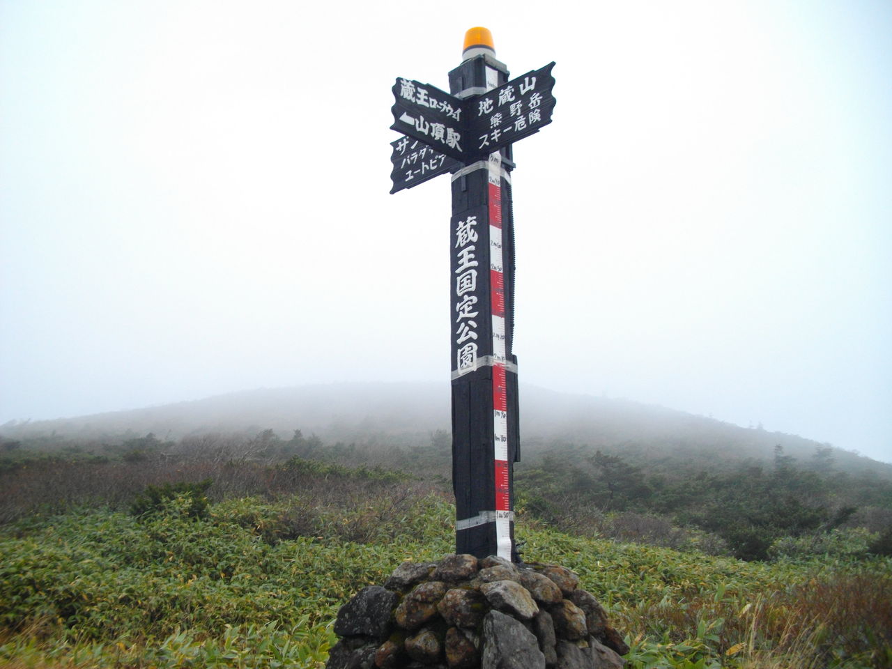 ef3f9335.jpgル・ベール蔵王玄関前・朝7時・8度・曇・中風、地蔵山頂駅・朝8時・1.3度・曇・風速5m・視界50m、朝9時山麓駅駐車場・混雑・大型観光バス駐車・龍山・鳥兜岳・伝蔵山・三郎岳・五郎岳黄葉が全て紅葉になった。地蔵山頂駅・10時・0.3度・強風・視界数百m。写真は地蔵山頂駅からの参道正面の案内柱に設置された積雪メジャー1,5m〜3,4m迄スキーヤーが自分で積雪を確認出来ます。蔵王ロープウェイがスキーヤーが自分で積雪を見えるよう10月13日に設置してくれました。地蔵山頂駅スタッフの話では今朝ー0,5度だったと教えてくれました。標高1,400m以下黄葉が無くなり標高700m迄紅葉になりました。ニ・三日ご覧いただける様です。