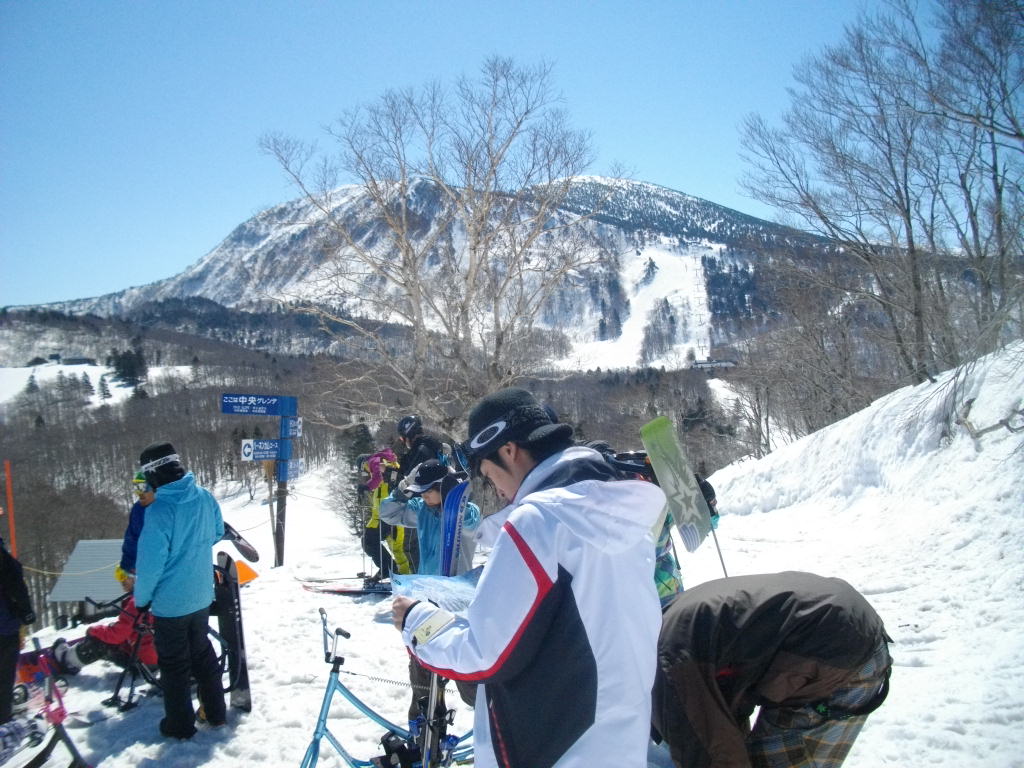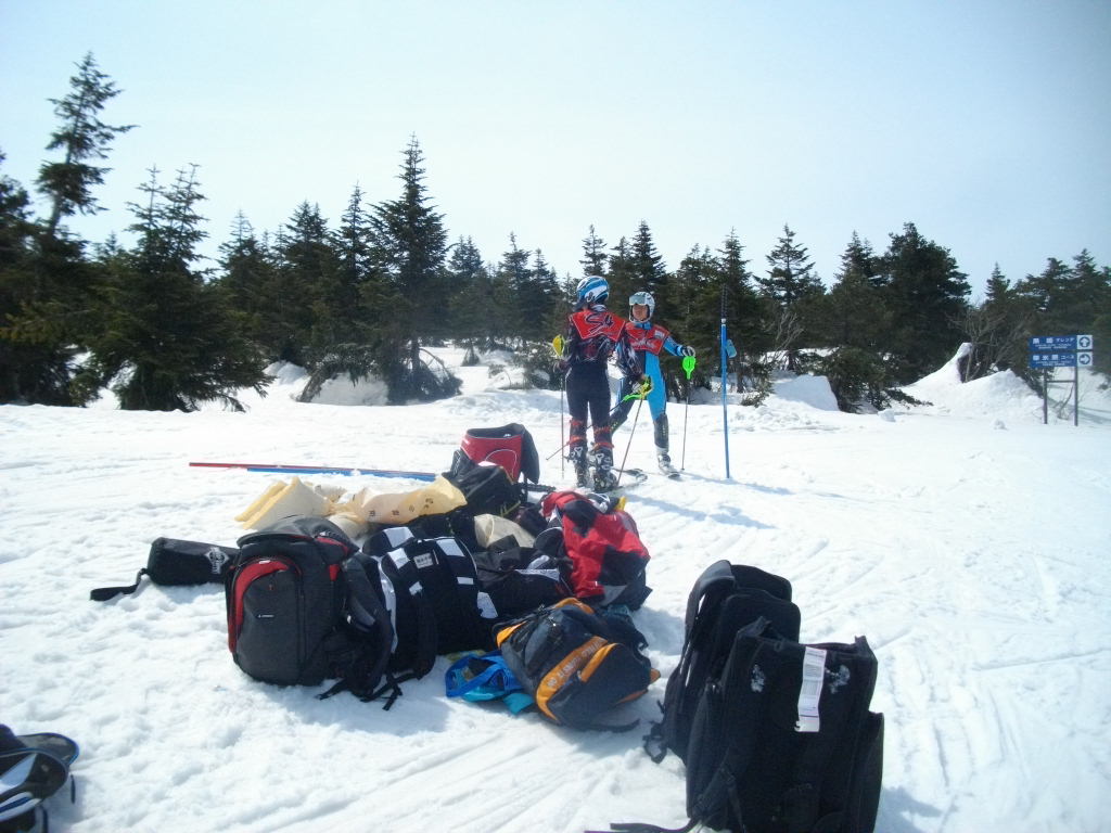 中森ゲレンデにスキーを滑るため行きましたが昨夜の雨で温泉駅までの積雪消えてしまいました。温泉駅で新しいスキー・硫安を駅に運び上げていましたので作業している方に聞いた所、仙台の石井スポーツの皆さんで例年行っている来年度スキーの試乗会の為、ニューモデル50台位と硫安を鳥兜駅にあげていますとの事でした。5月4・5・6日3日間朝9時30分から行うそうです。鳥兜駅・7度・濃霧・視界20m弱・バーン全面滑走可・硬いエッジがやっと刻める程のバーンでした。写真は仙台石井スポーツの皆さん・是非試乗会にお出で下さいとの事、当日現地に来ると話していました。鳥兜駅出口階段4段が雪の上で9段雪の下です。鳥兜リフトスタッフが少ないので皆さん休みとたずねた所明日営業するリフト乗り場に雪つけに行っていますとの事でした。IMGP4699