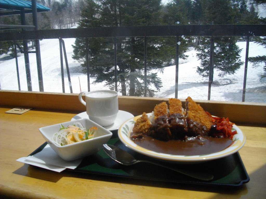 ル・ベール蔵王玄関前・朝7時・8度・濃霧(50m先の蔵王中央ロープウェイゴンドラ雲の中)・無風。地蔵山頂駅・5,5度・曇。今日蔵王エコーライン昨年11月からの冬季閉鎖解除・朝11時開通式典です。蔵王河童「古希」の日・夜21NHKBS3プレミアム「新日本風土記」で蔵王放映します。写真はレストラントドマツ「三元豚カツカレー・1,100円」です全面滑走出来るユートピアゲレンデを見ながらお楽しみ下さい・コーヒーは平日5回ユートピア乗車サービスです、ゴールデンウィーク中にゲレンデで昼食が出来るレストラン2軒・他に地蔵山頂レストランの「季節のパスタ」がおすすめです。整備運休中だった蔵王中央ロープウェイ営業再開しました。今日のリフト営業は鳥兜リフト・ユートピアリフトの2本です。明日は片貝リフト・パラダイスリフト2本が営業します???黒姫リフトは営業終了しました。