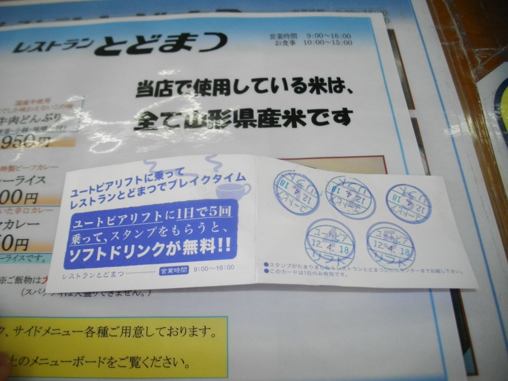ル・ベール蔵王玄関前・朝7時・4度・晴・無風・陽がサンサンと輝き絶好のスキー日和です。地蔵山頂駅・ー0,5度・晴・三宝荒神山に鶯が飛んできて春の囀りが聞けると思います。蔵王ロープウェイではロープウェイ4区間+リフト往復+ソフトドリンク付2,200円の宿泊者割引を始めました。昼食付は3,000円です、フロントにパンフレットを置いてあります。写真は平日ユートピアリフト5回乗車するとレストラントドマツでソフトドリンクサービスのスタンプを押したカードです。仙台からのスキーヤーの皆さん大喜びでゲットしていました。今週末はリフト数本営業します春スキーにお出で下さい。