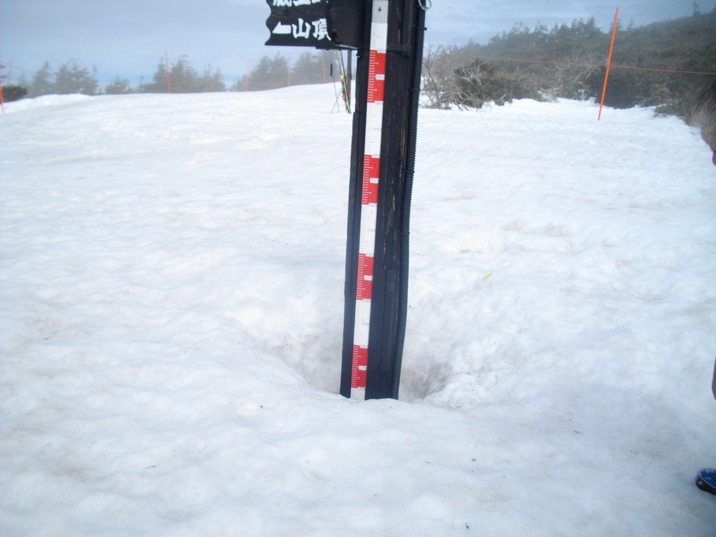 ル・ベール蔵王玄関前・朝7時・7度・薄曇り・無風・写真は地蔵山頂に設置された積雪確認メジャーです、昨日朝170cm迄雪がありました。地蔵山頂から横倉まで約9km昨日17分で滑り降りました。全面滑走出来ます。地蔵山頂から上の台ジュピア迄約5kmも全面滑走出来ますがパラダイスゲレンデから大平コース迄数分歩く必要があります。ユートピアゲレンデから菖蒲沼ゲレンデまでの連絡コース残雪多く滑走可能ですが菖蒲沼リフト終了したので数百m登る必要があります。地蔵山頂駅・2度・積雪145cm・曇。