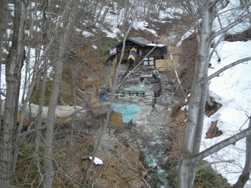 ル・ベール蔵王玄関前・朝7時・4度・曇・無風・どんよりとした風景です。地蔵山頂駅・−0,3度・曇・横倉ゲレンデ積雪80cm。昨年11月中旬から冬季閉鎖していた蔵王名物露天風呂が蔵王温泉ホームページに「蔵王温泉大露店風呂オープン」と掲載されました。4月21日朝8時30分から18時迄4月27日・4月28日〜10月朝6時〜19時迄です。ル・ベール蔵王では450円の入浴料を300円に宿泊者割引をいたしています。フロントでお求め下さい。写真は昨日かもしか大橋から写した男子浴場です。準備が順調に行われていました。今日・明日の蔵王温泉天気予報は蔵王ロープウェイホームページによるとお日様マークです。雪焼けに気をつけて下さい。