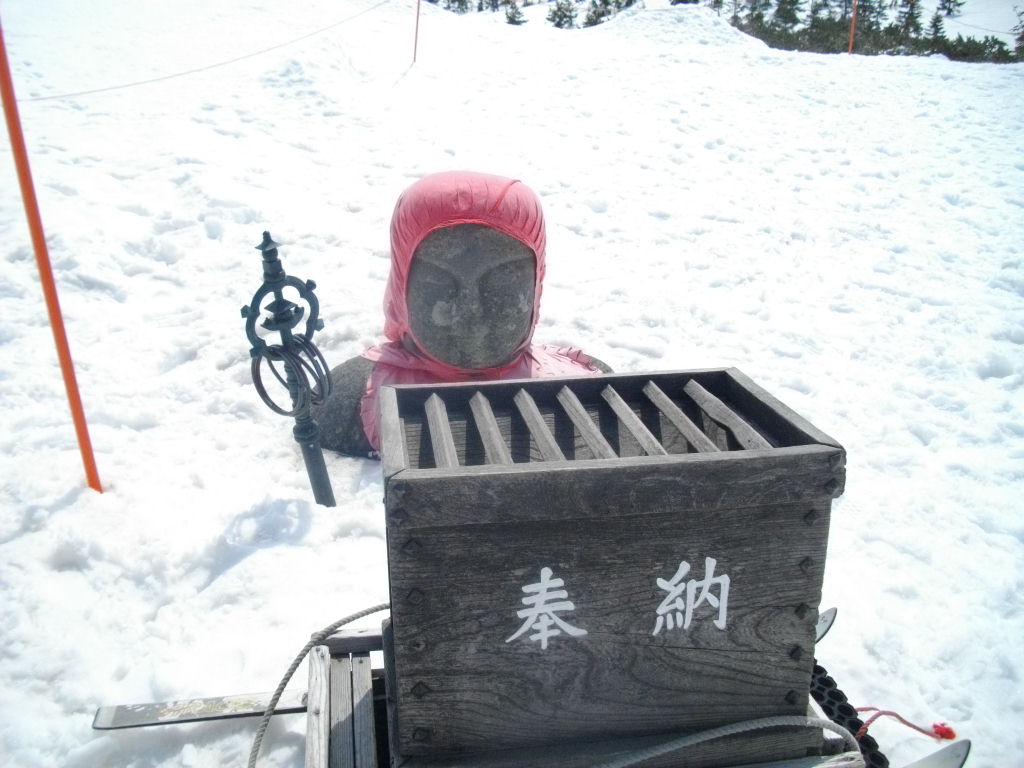 ル・ベール蔵王玄関前・朝7時・6度・晴・陽がサンサンとふりそそいでいます。雪焼け止めが必要です。地蔵山頂駅・3,6度・晴、今日は春スキーの雪質ザラメになるようです。地蔵山頂より横倉山麓まで9km一気に滑り降りれます。地蔵山頂から上の台ジュピア迄5kmも大平コース入口を歩くだけで全面滑り降りれます。写真は蔵王地蔵尊様です、御手が雪の上に出てきました。今日は熊野岳と雪の蔵王お釜鑑賞に山スキーの好きな方には絶好の日和です。