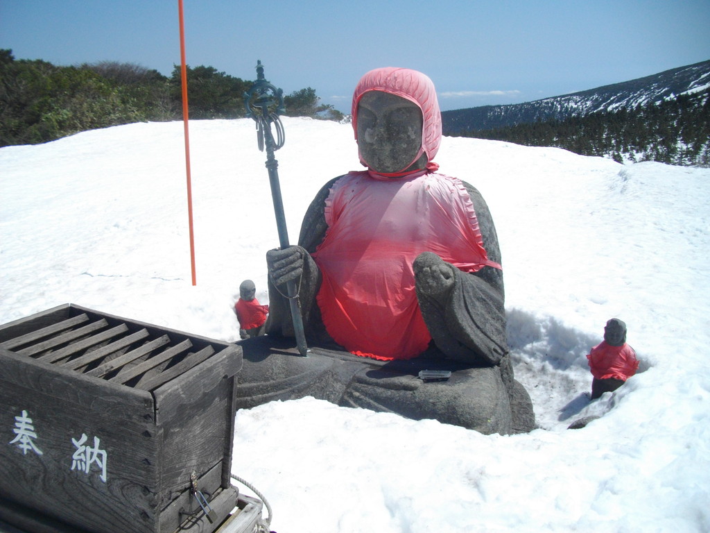 ル・ベール蔵王玄関前・朝7時・10度・晴・陽がサンサンとふりそそいでいます・無風・視界良好、写真は蔵王地蔵尊様です、膝まで雪が無くなり両脇の小地蔵様も雪の上に出てきました。昨日地蔵山方面に登山している方多く見ました地蔵山頂駅に登山届を提出してお出でになって下さい。後8日でリフト営業が終了します・ザンゲ坂は全面滑れます、最後の春スキーに挑戦して下さい。今日刈田駐車場行きバスが今シーズン営業再開します朝10時10分蔵王温泉バスターミナル発です、帰りは13時刈田駐車場発です。今シーズンから土・日・祝日のみ運行です。上山温泉観光協会のお釜行き無料バスは毎日運行していますお問い合わせしご利用下さい???