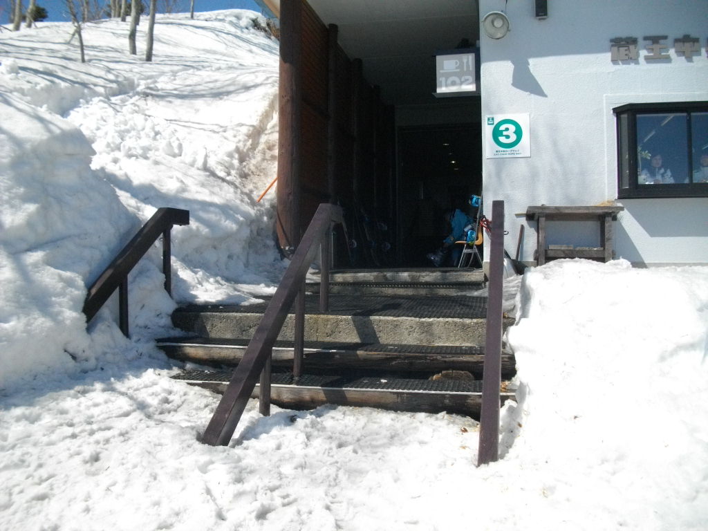 標高900m中森ゲレンデから温泉駅に滑り降り中森リフト6乗車・全面圧雪されてスピードを出して滑れた、鳥兜駅・2度・10m前後の強風・鳥兜ゲレンデZAOS4がポール練習・コーチ数名来ていた、三郎リフト乗車数台待ち・スノーパークにヤングボーダーが多くジャンプをしていた、スノースクーター10台以上滑っていた。鳥海山・葉山・月山・大朝日岳・吾妻連峰・飯豊連峰が見えた、蔵王温泉の鴫の谷地沼・盃湖全面凍結・片貝沼雪が覆い沼の形が分から無い程の残雪、温泉駅駐車場第一・第二共満車、写真は鳥兜駅出口階段雪の上に3段出ていますが10段まだ雪の下です。