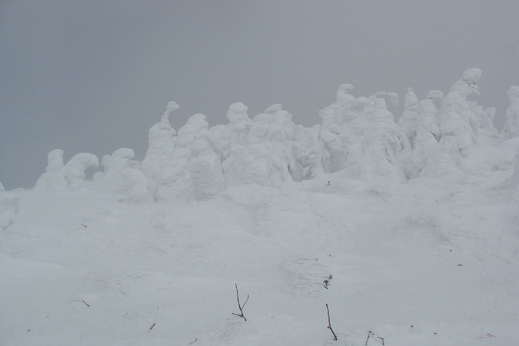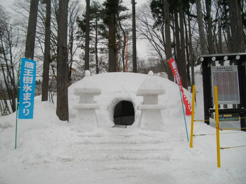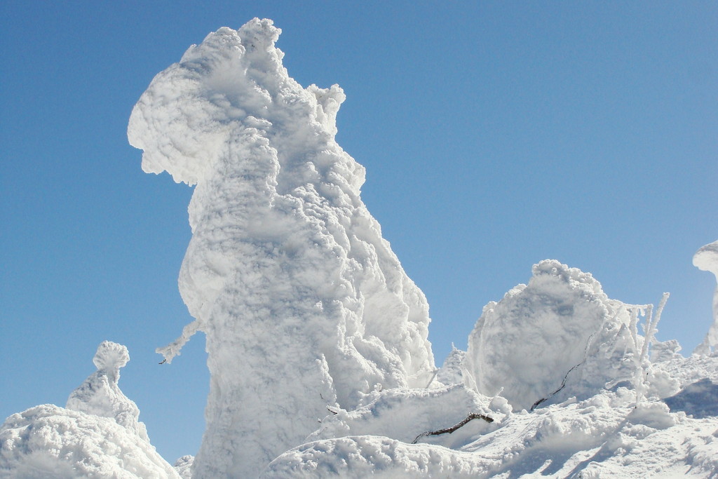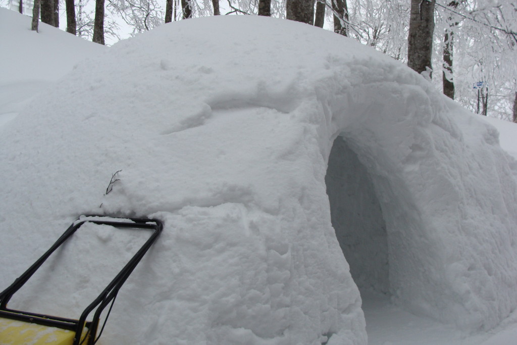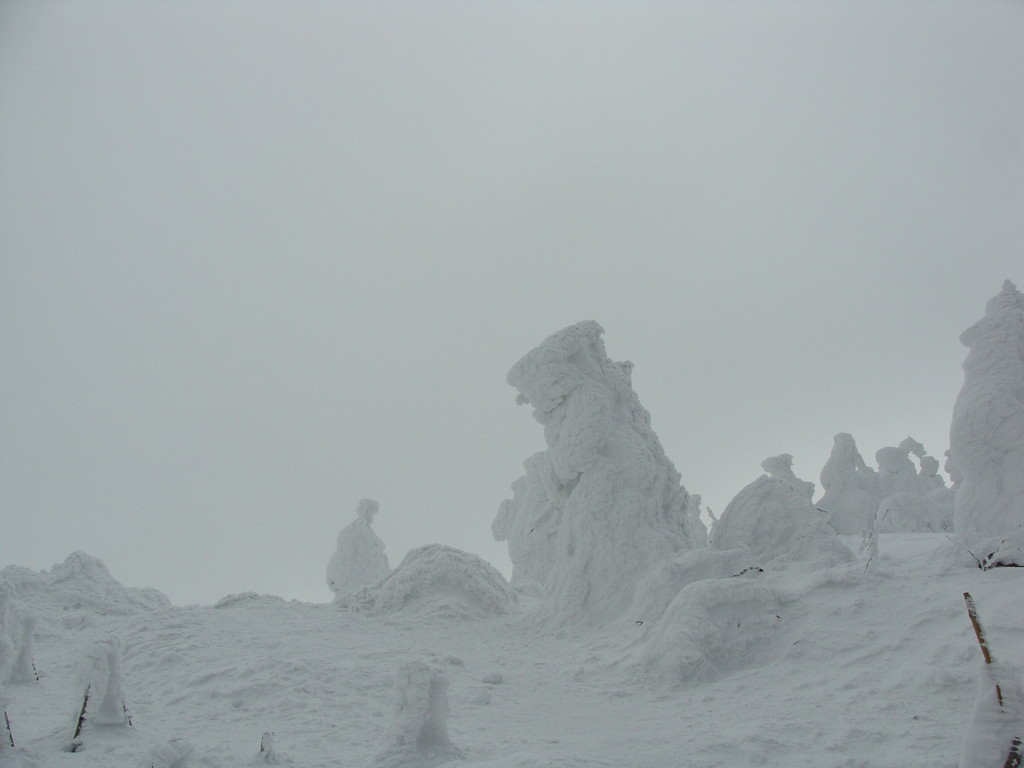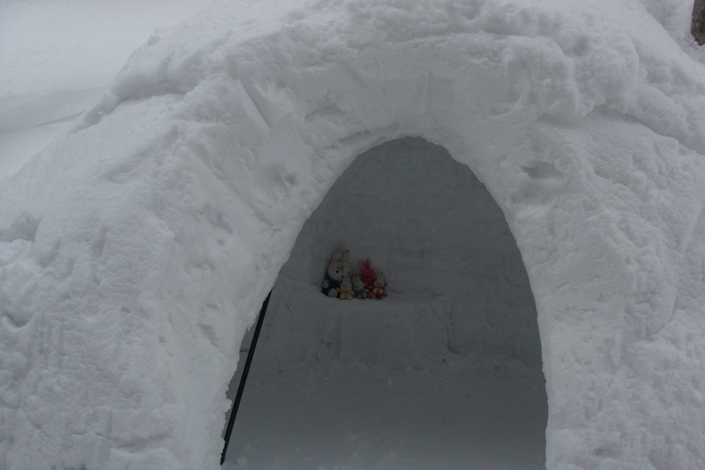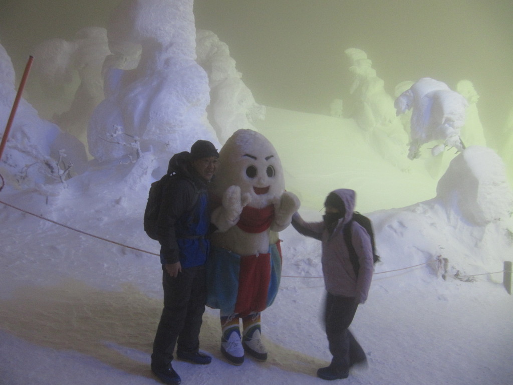 ル・ベール蔵王玄関前・朝7時・ー8度・雪・新雪30m以上・濃霧・視界20m・蔵王中央ロープウェイの架線(ロープ)雲の中・スタッフが早朝から除雪で汗だくです、お客様のマイカー雪に埋まっています。弱風・一時間に数センチ積もる雪が降っています。地蔵山頂駅・ー14度・ユートピアゲレンデ積雪量更新285cm・雪。写真は昨日午後の地蔵山頂駅の標準樹氷(毎年地蔵山頂駅右前のアオモリトドマツの樹氷を写しています。)です。2枚目は標識98番の三宝荒神山の樹氷です。3枚目は見返りリフト乗り場にやっと造ってくれた鎌倉です。4枚目はかまくらの内部です例年通りうさぎが置いてありました。5枚目は2月2日の樹氷まつりにジュピアに造ってくれた「ジュッキー君」です。記念写真を写しているカップルがおいでです。今日はゲレンデ両端・コースの両側吹だまりがあります注意してお滑り下さい。ロッカスキーが最適の日です???