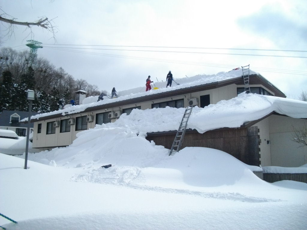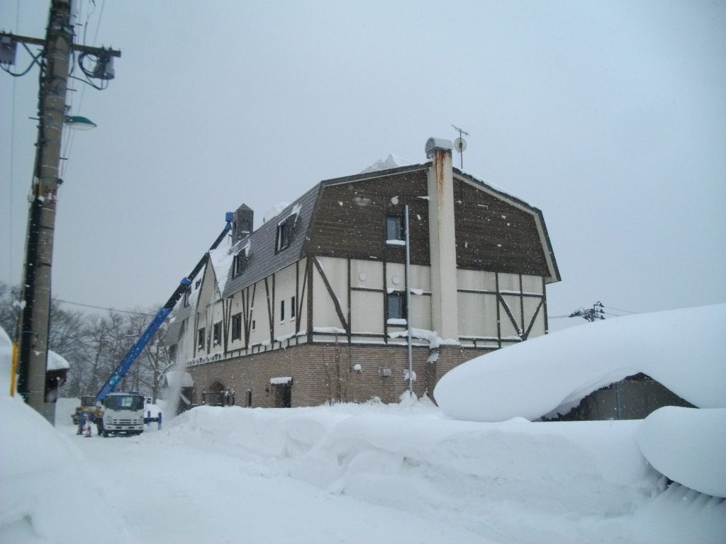 写真は入口手前右の三共第一製薬蔵王山荘3階上の屋根の雪下ろしを高所作業車で行っている所です。屋根に5フィート以上積り落下すると道路の車を直撃の恐れがあります。入口も3回目の除雪で5フィート弱の積雪でした。大型バケットで中森道路右のゲレンデ側に数メートルの雪山になっていました。2枚目はゲレンデ側からの写真です。中森ゲレンデ7度とあたたかくバーン水っぽい雪質になりました。3枚目は数回屋根の雪降ろしをした蔵王温泉大露天風呂入口門の屋根です。カモシカ大橋も1m以上の積雪で橋の手摺上部迄の積雪です。サンライズ・ハーネンカム・上の台ゲレンデも3度と重い雪質でした。明日はアイスバーンで滑る事になりそうです???天候も落ち着いているのでムーンライトウオーク快適と思います。レストランOマネージャーウオーキングに行きました。
