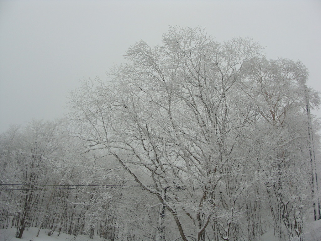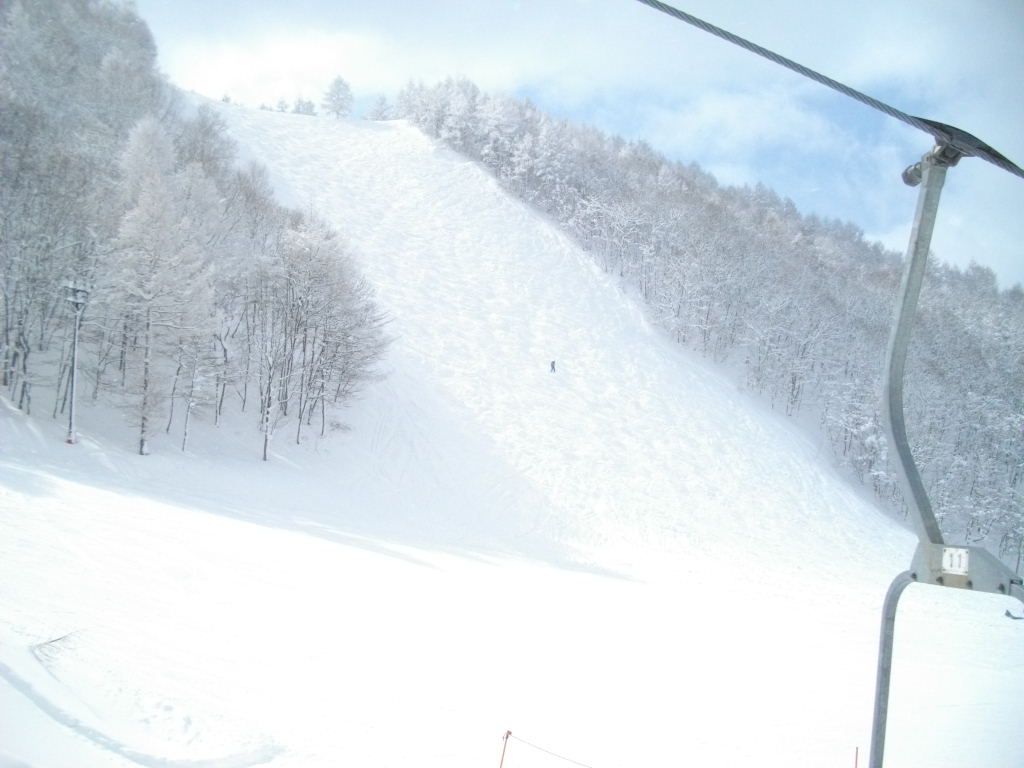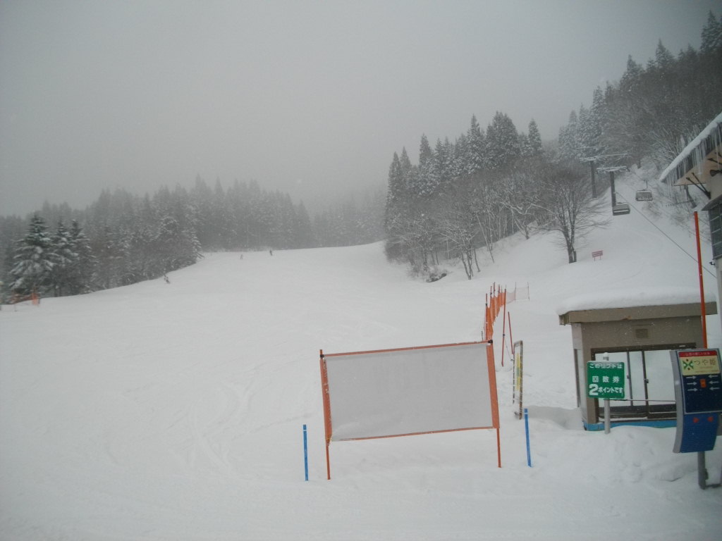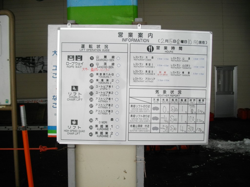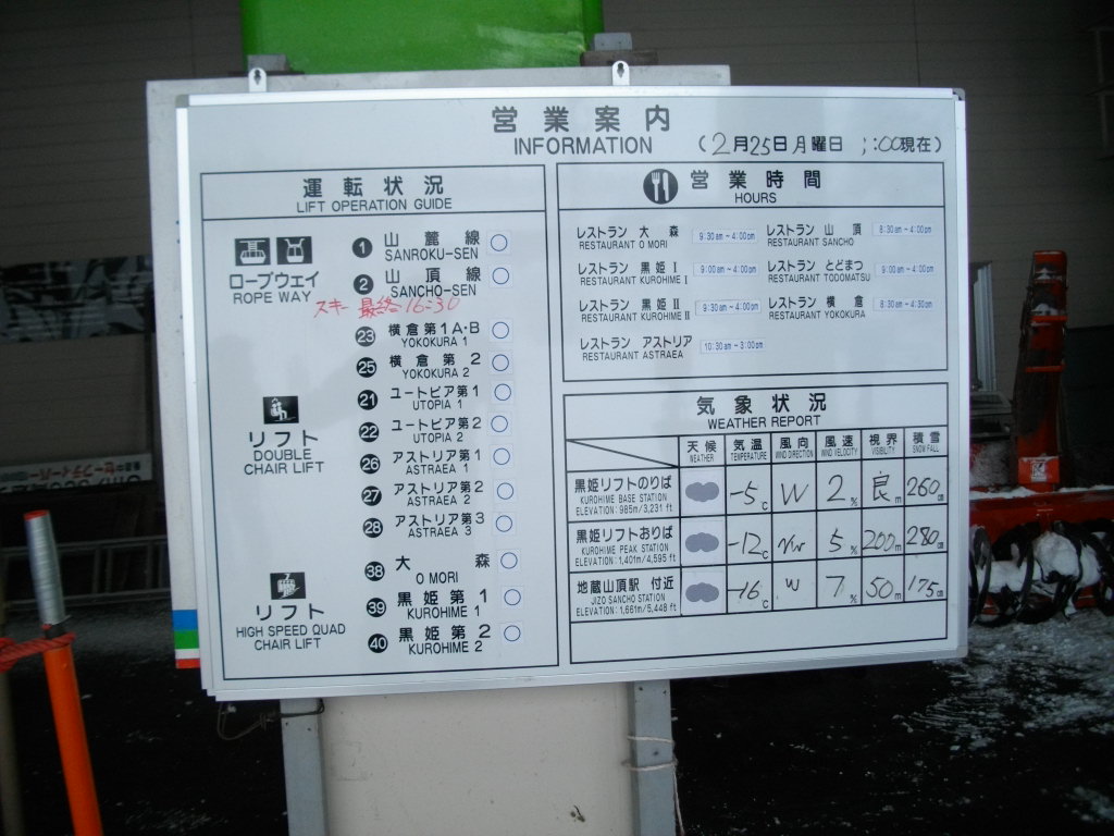 大森リフト上の横倉山の杉林です。2枚目の写真は黒姫第一クワットの営業案内です。11時時点で地蔵山頂駅ー16度・視界30mです。ホワイトアウトの為フニテル乗車断念しました。大森ゲレンデ圧雪していました。百万人ゲレンデも圧雪していました。黒姫ゲレンデ今日一番混雑していました。リフトも数台乗車待ちです。ユートピアー8度・ゲレンデで滑っている方無。片貝リフトー11度でした。ダイヤモンドもマイゲレンデー8度ここまでは全て雪が鳴ってくれました、パウダースノーでスピードが出る雪質でした。高鳥コース・ハーネンカム共滑っている方無くマイゲレンデでした。上の台ゲレンデにはボーダー・スキーヤーが沢山いました。サンライズゲレンデにはゼッケン組が講習をしていました。