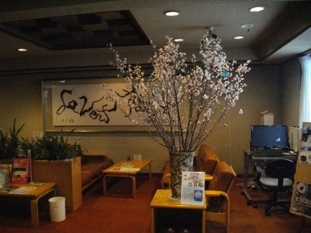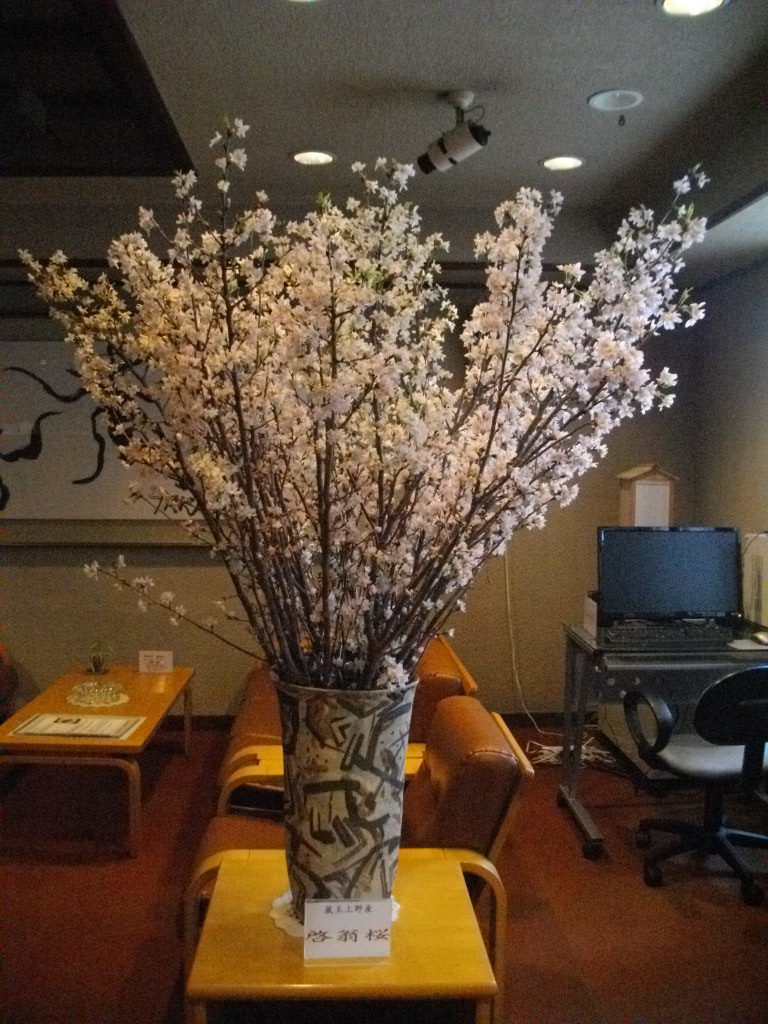 ル・ベール蔵王玄関前・朝7時・ー6度・猛吹雪・新雪20cm以上・隣の東京海上蔵王山荘雲の中・駐車場ホワイトアウトで除雪車運転のスタッフ視界0見え無く苦労して除雪作業しています。山頂線・大森リフト・黒姫リフト運休しています。猛吹雪で樹氷大きく成長していると思いますがご覧いただけません。今日はゲレンデ・コースに吹だまりが有り視界が無いので注意してお滑り下さい。ここ3日で50cm以上の積雪ユートピアゲレンデ猛吹雪で飛ばされなければ3m以上の積雪になったようです???写真は昨日の標高1,200m付近のブナ林の霧氷です。蔵王上野産「啓翁桜」第3号が届き女将がロービーに飾りました。