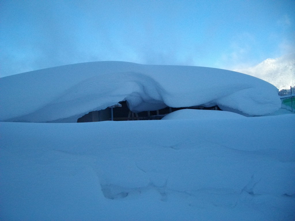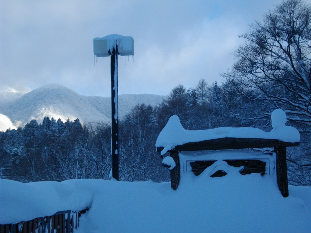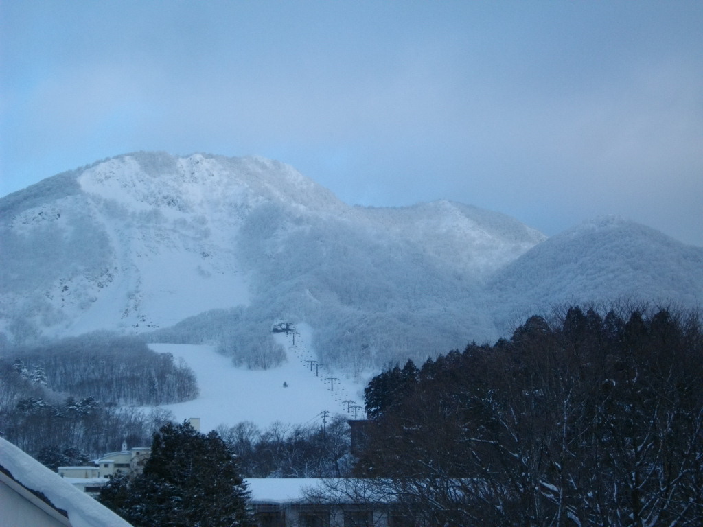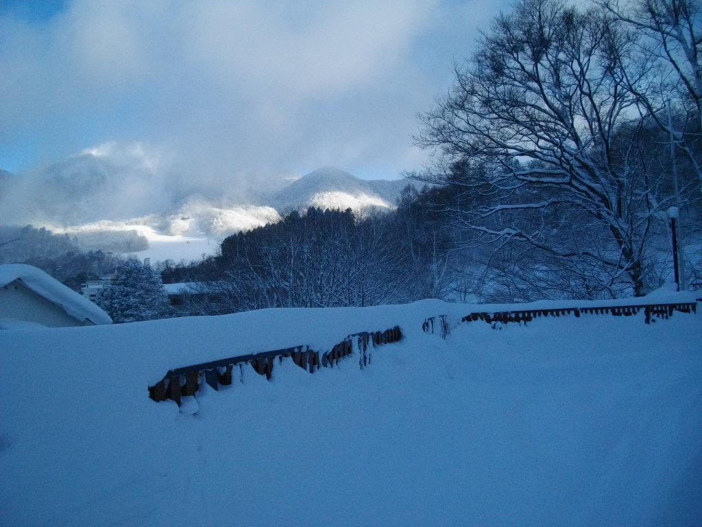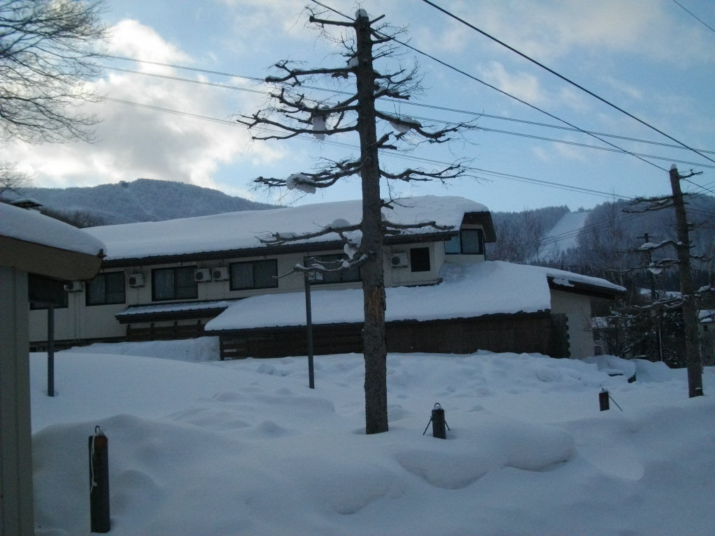 ル・ベール蔵王玄関前・朝7時・ー10,5度今シーズン一番寒い朝・晴・視界良好・新雪50cm以上・写真は玄関前屋根の雪は5フィート以上です。2枚目は南側通路と蔵王中央ロープウェイの鉄塔です・3枚目は龍山方面です。4枚目は先々週雪下ろしをした荘内銀行屋根の雪です、6フィート以上の積雪大至急雪下ろしをする必要があります。蔵王ロープウエイホームページによると地蔵山頂駅・ー17度・積雪2mと今シーズンの記録更新・ユートピア340cm・横倉ゲレンデも2mと積雪更新。昨夜圧雪しているので大森・黒姫・樹氷原コースは新雪50cm以上の深雪でお楽しみいただけます。日も昇りここ数日の荒天による樹氷の成長した写真を写せます????昨日16時30分以降の山形新幹線運休になりました、一昨夜お泊まりのお客様仙台経由で東北新幹線にお乗りになり東京にお帰りになったようです。某大使館のアルファーロメオで東京からお出での参事官東北道村田から福島西まで通行止めの為急遽もう1泊お泊りになりました。