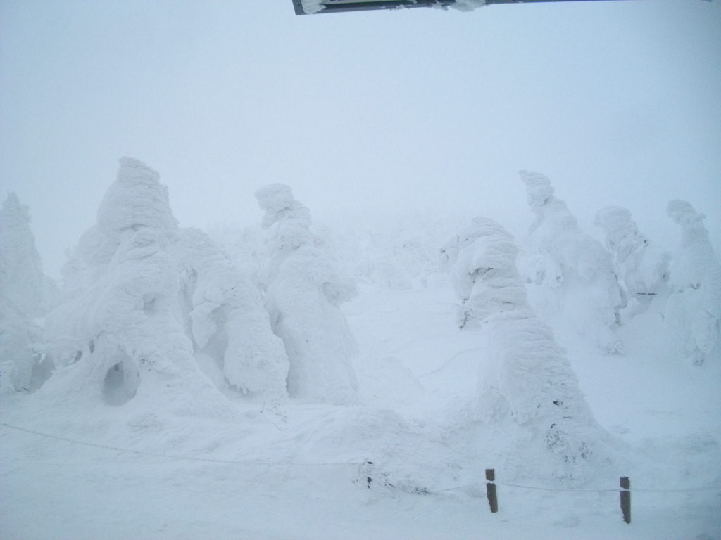 ル・ベール蔵王玄関前・朝7時・ー8度・新雪1cm・曇・弱風・駐車場全面パウダースノー・標高1,000m以上雲の中、地蔵山頂駅・ー15.5度・視界50m(山麓駅に電話で確認)・写真は柵が大雪におおわれている風景です。2枚目は大森リフト上降り場の小さい雪像です、反対側にもあります。降りる時にご覧いただけます。3枚目は昨日午後のユートピアリフトで写した写真です。濃霧で樹氷写せません。今日も樹氷の写真は撮影出来ないようです。2月終わりなのにまるで1月の天候です。昨日蔵王ロープウェイトップにまだまだ樹氷が鑑賞出来るので樹氷ライトアップ3月中旬まで延長しませんか?と話した所難しいとのお答えでした。身体障害者の割引について確認した所、蔵王ロープウェイでは身体障害者の皆さんで鉄道割引適用と同じ50%割引をロープウェイで行っていますとの事でした。