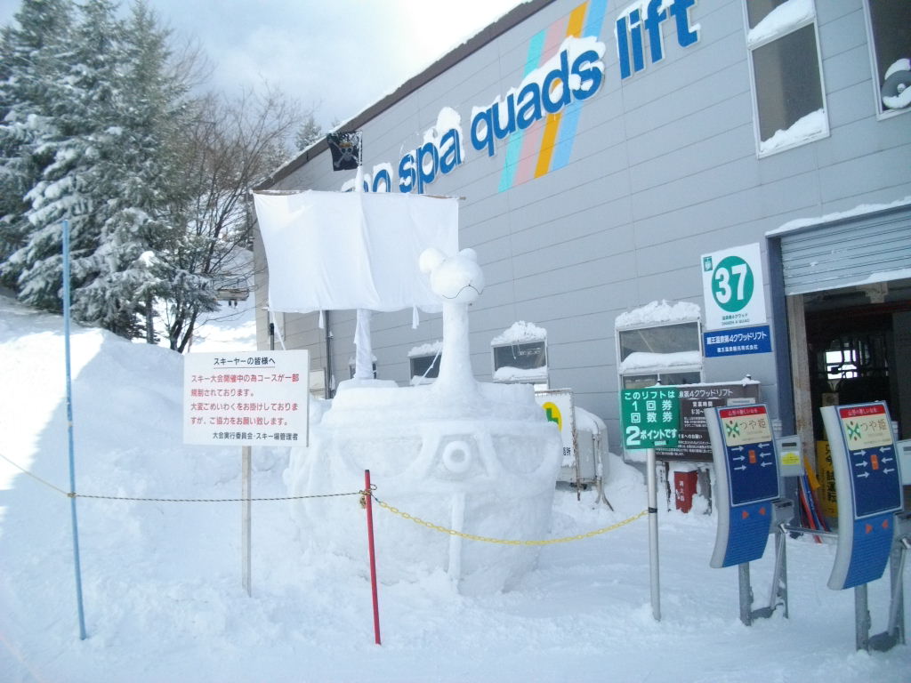 ル・ベール蔵王玄関前・朝7時・ー6度・小雪・新雪1cm・強風隣の東京海上・日動火災蔵王山荘の巨木ゆらゆら大揺れです。標高1,300m以上の伝蔵山は雲の中・龍山も頂上は見えません。写真は上の台温泉第四高速クワットスタッフが製作した海賊船の雪像です、船に乗り写真を写しているヤングファミリーが蔵王温泉の思い出にしています。カップルでもお二人の思い出に写して下さい。写真は中森第二リフトの斜度25度の壁を見事に滑っていられる東京からお泊まりのA米寿スキーヤー様です。蔵王河童17年後にこんなに見事に滑れるか節制し訓練が必要???昨日も中央高原高鳥入口からハーネンカム⇒上の台⇒龍山リフト迄ノンストップで約3キロ滑り降りました。リフトから次のリフト迄ノンストップで蔵王河童が滑りご一緒にお滑りです。(一昨日も黒姫コース約2km・大平コースも約3kmサンライズリフト乗り場までノンストップでした。)
