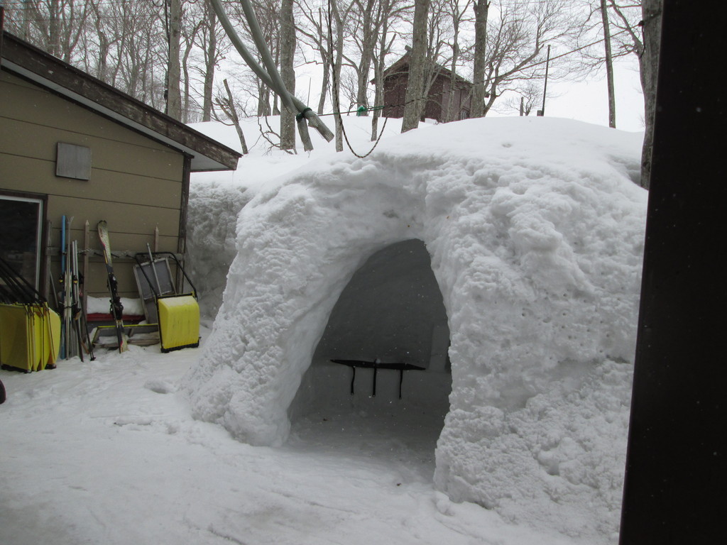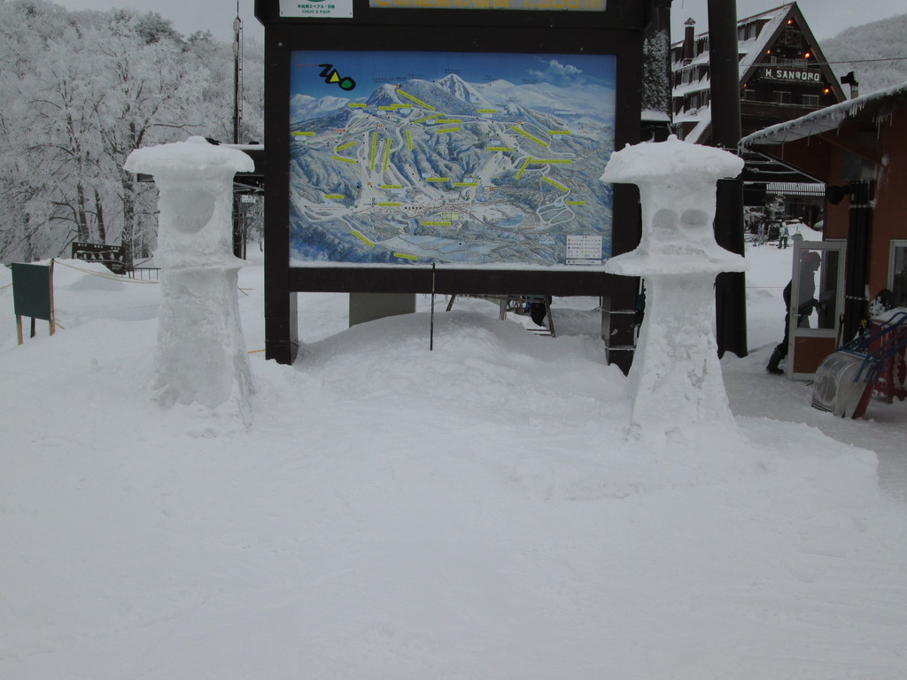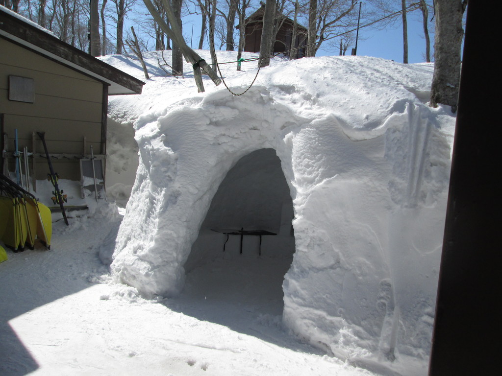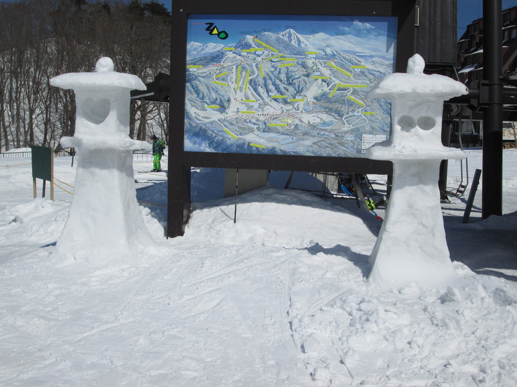 見返りリフト乗り場のかまくらまだ残っていました。三五郎リフトの雪灯籠もありました、三五郎ゲレンデのボーダー用大ジャンプ台5基もお飛びいただけます、スキーでジャンプなさる方は気をつけて下さい。