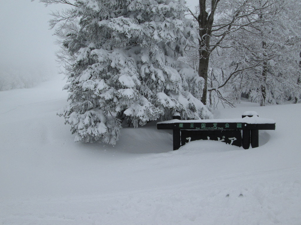 標高1.300m以上ホワイトアウトユートピアゲレンデの看板埋もれています、3mの積雪実感できます。夏に看板の前に立ち看板の上はさわれません!!!