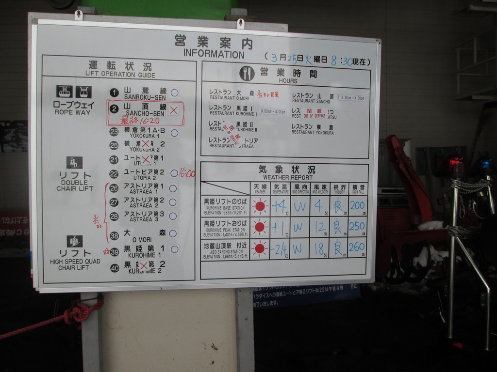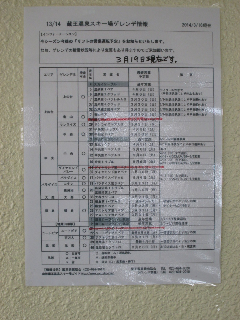 昨日今後のゲレンデリフト営業状況を内玄関に掲示しました。
