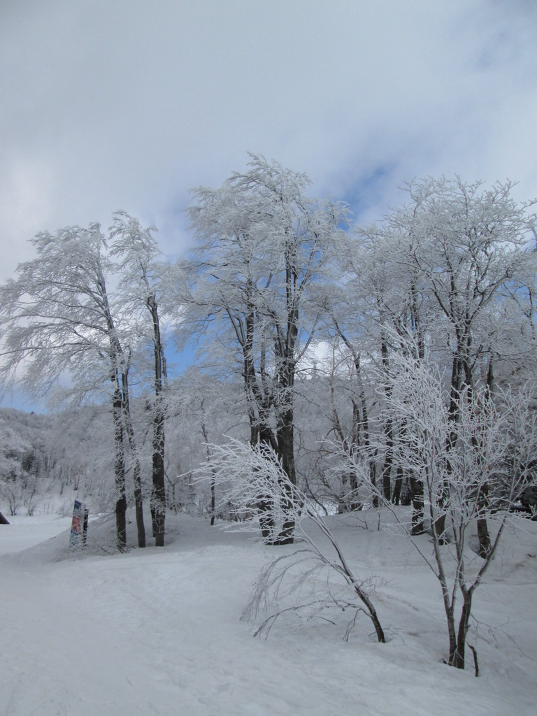 蔵王スカイケーブル標高1,200m付近の木々です。スカイケーブルの滑車はゴムを使用していない(古いので鉄鋼??)ので凍結しなかった???