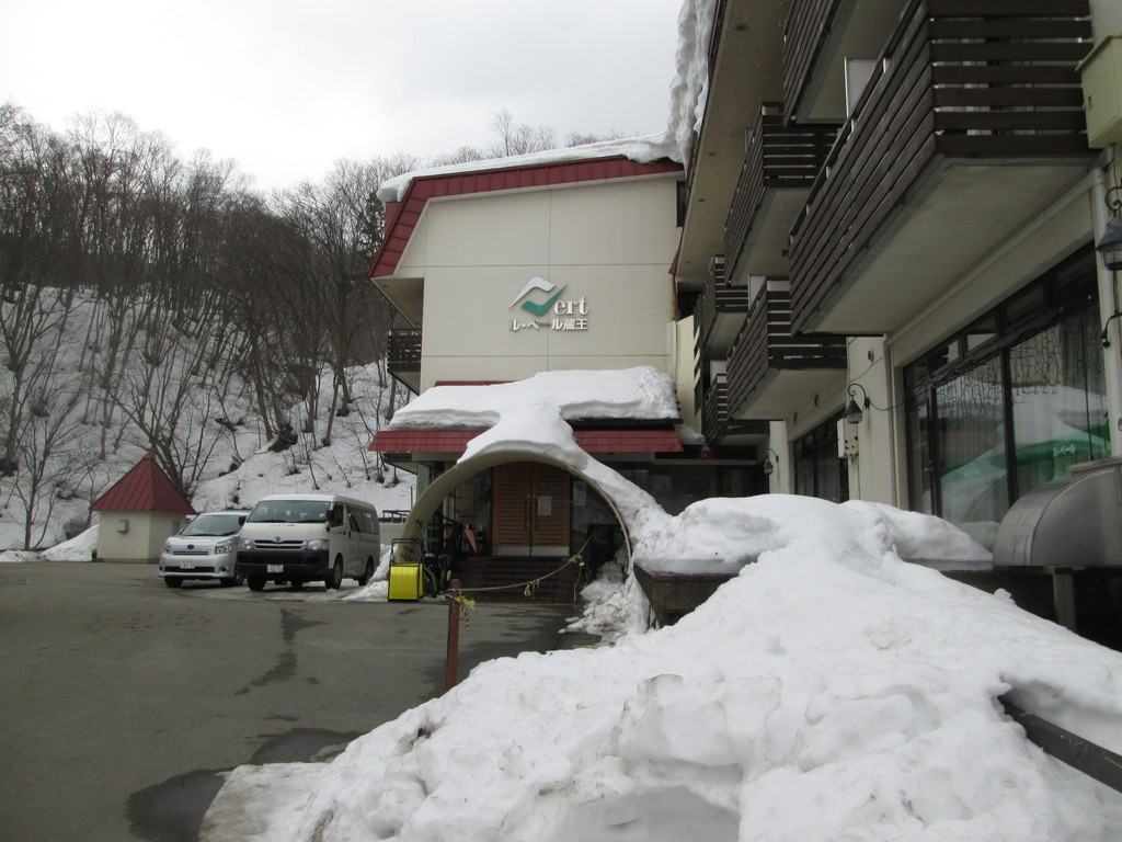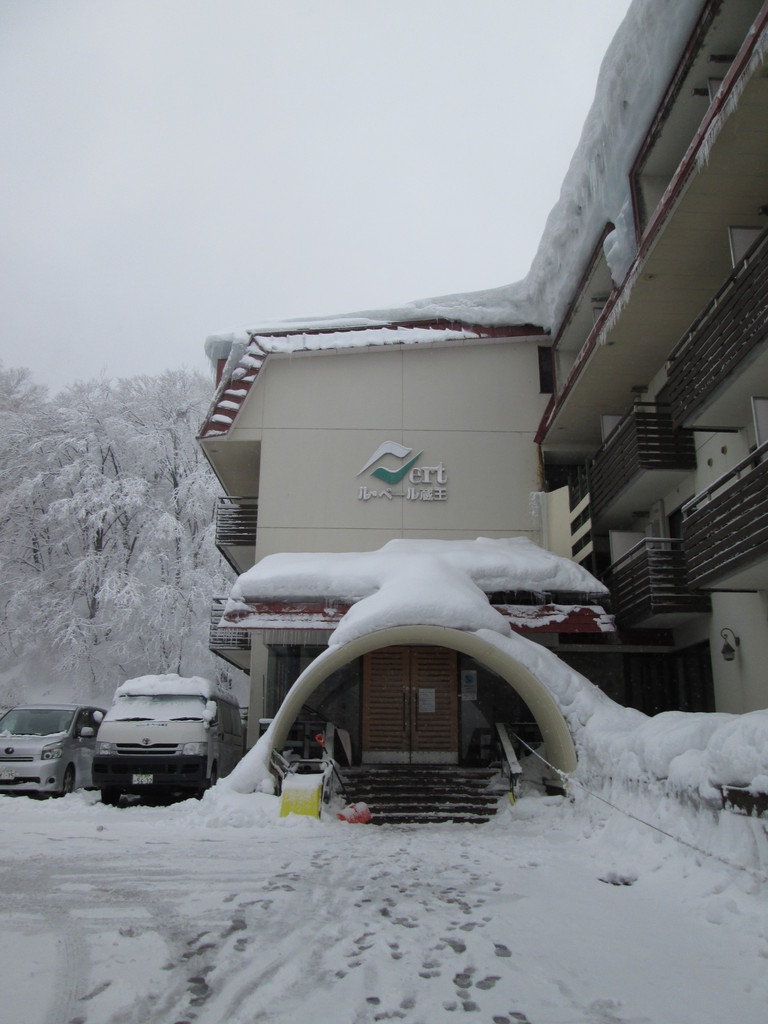 ル・ベール蔵王玄関前・朝7時・ー2度・10cm以上の春のドカ雪数年前もこの時期に大雪が積もり膝の腱を切断した方が続出???ゲレンデ・コース両脇の新雪吹き溜まりで数十センチスキーをとらえて曲がれないほど重い雪です・注意!!注意!!濃霧・無風・視界不良横倉山雲の中。昨日三五郎リフトの雪灯籠まだ健在でしたがハートのロウソクを立てる灯篭部分は壊れていました、隣のさくらんぼは原型を保っていました。