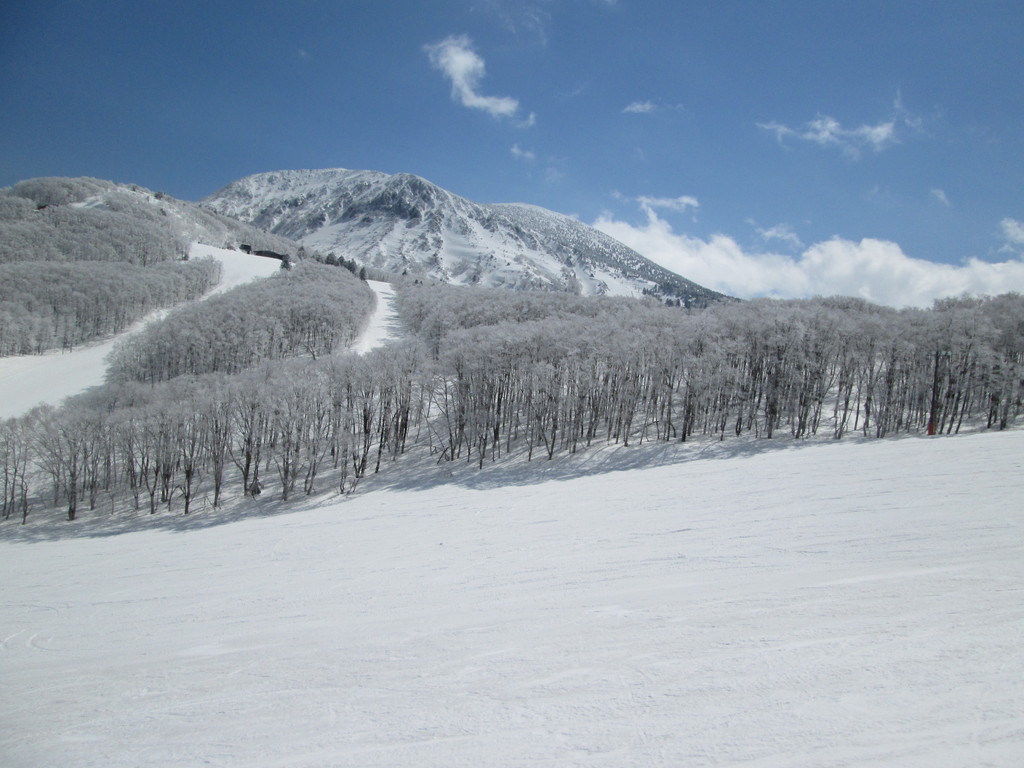 標高1,400m樹氷原コース55番標識奥から三宝荒神山・地蔵山を写しました、まだ標高1,500m以上上に樹氷が健在でした。