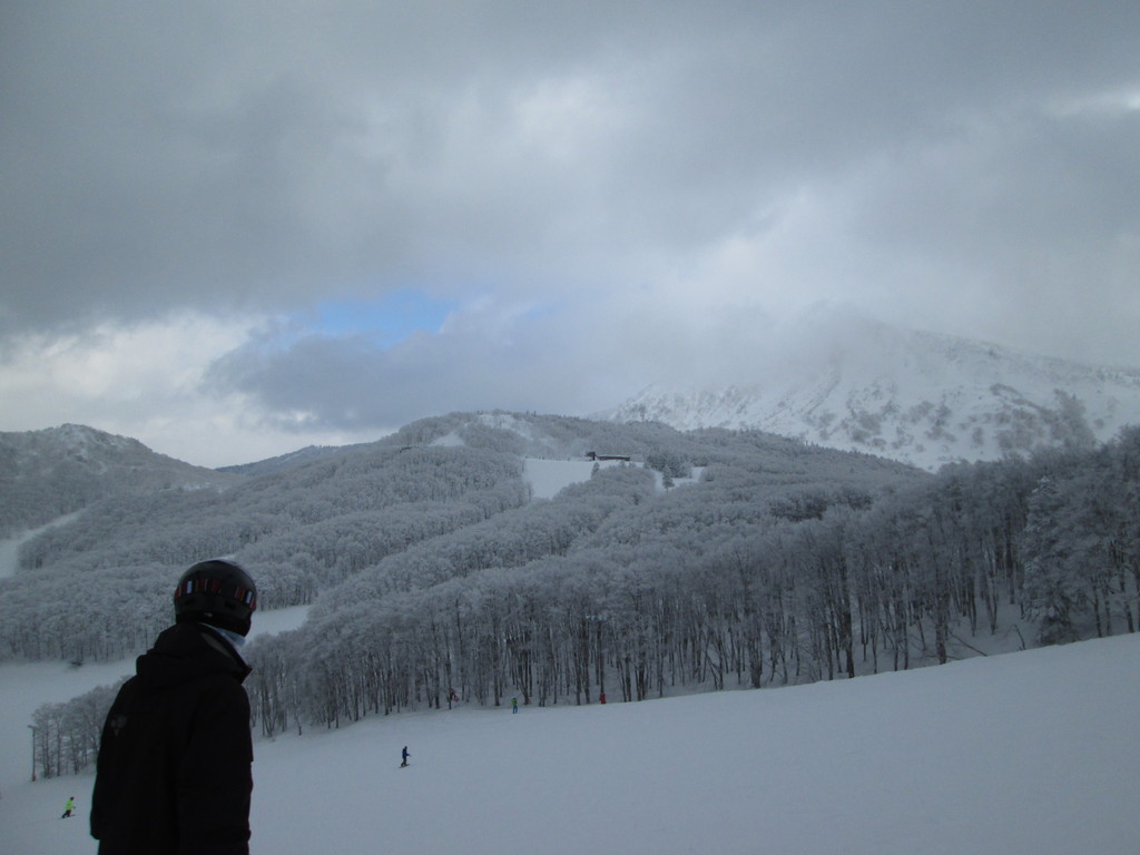 ル・ベール蔵王玄関前・朝7時・1度・曇・うっすらと雪が駐車場に・弱風・地蔵山頂駅・-5.3度・くもり・ユートピア積雪300m・写真は国体の壁・ボーダーが背中で滑り降りて来ていました、伝統のスキー競技第78回蔵王スキー大会は壁下の標高1,1500mがスタート???今日が大平杯ジャイアントスラローム・明日は山形市長杯スラロームです。小学3年から50歳以上の10クラス約300名が挑戦します。第22回大会??に蔵王河童も挑戦しました。禮子女将は3冠王(滑降・GS・S)もゲットしています。滑降はザンゲ坂スタートで大平コースを滑り降りました。