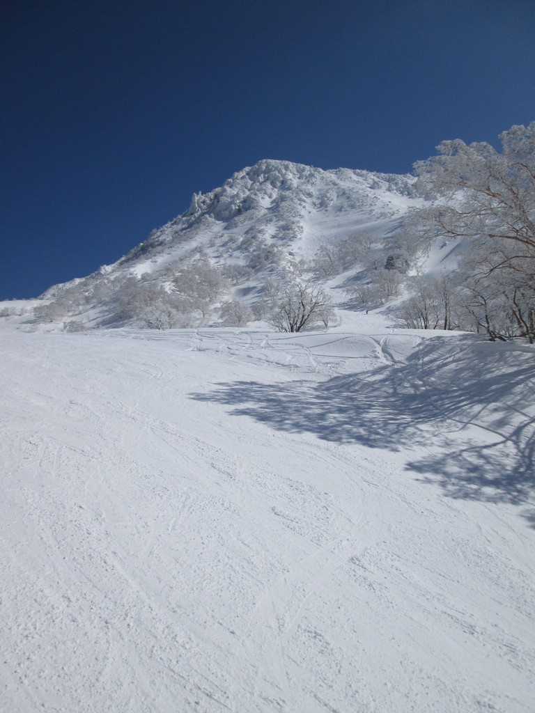 朝1本のシュプールでしたが11時に2本になっていた横倉の壁です、雪崩の危険があるので閉鎖されている蔵王の名物急斜面斜度38度のコースです。