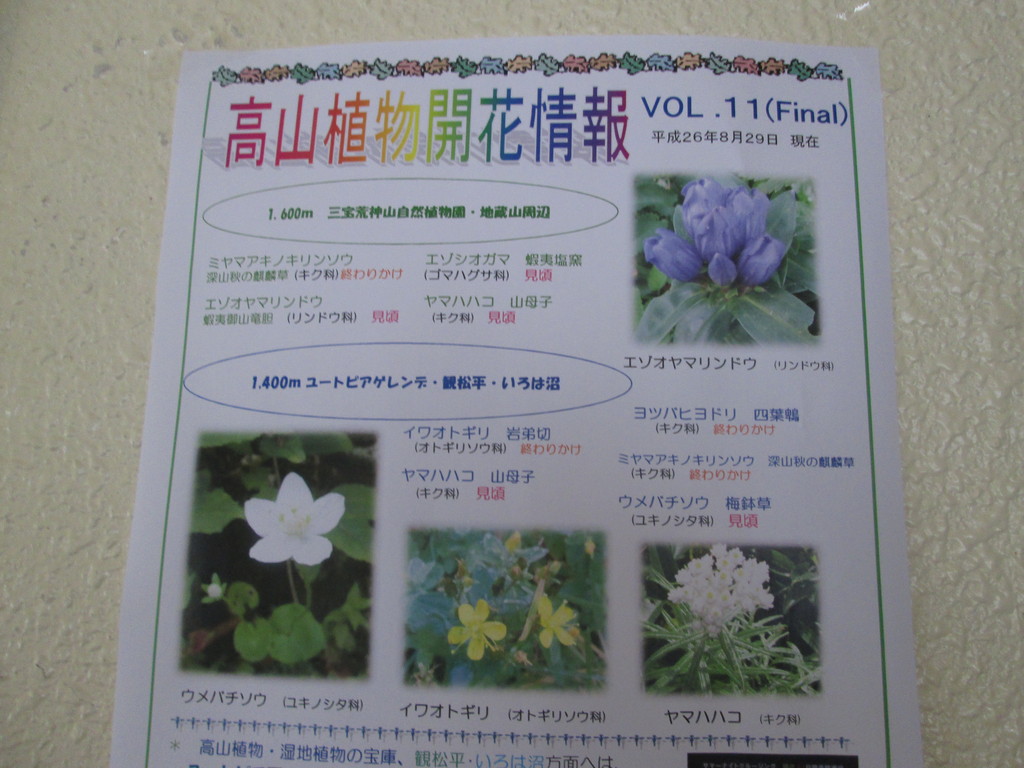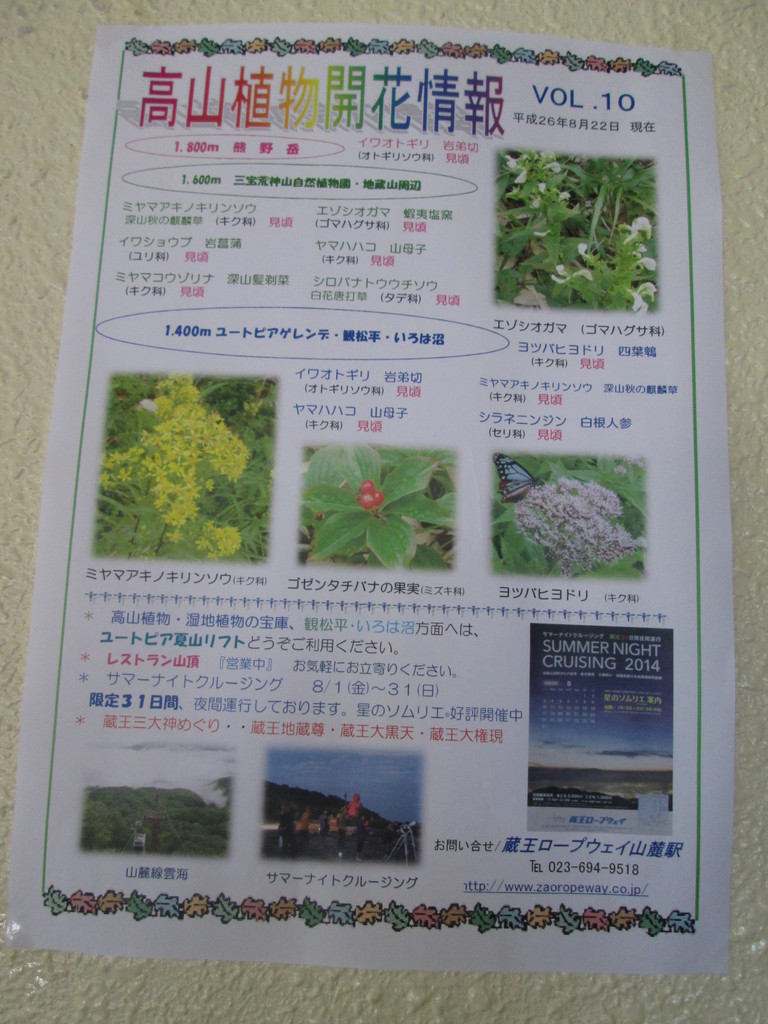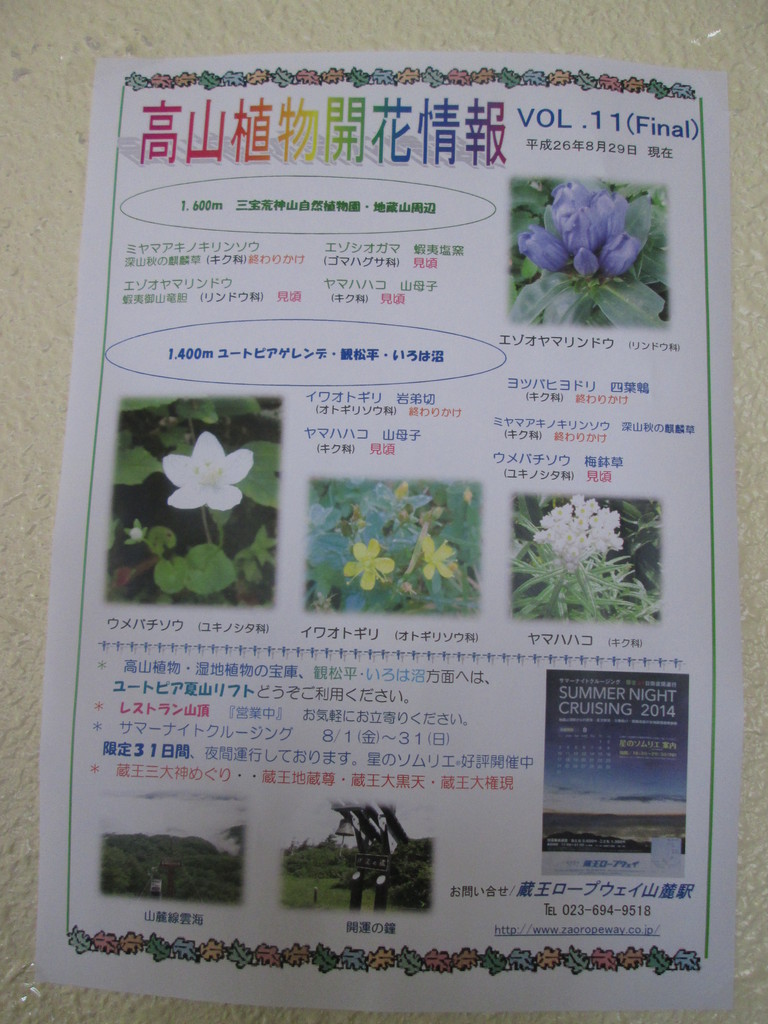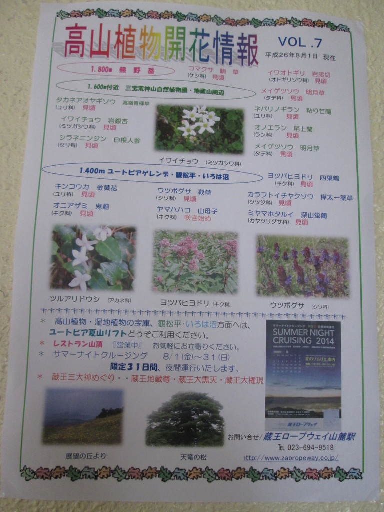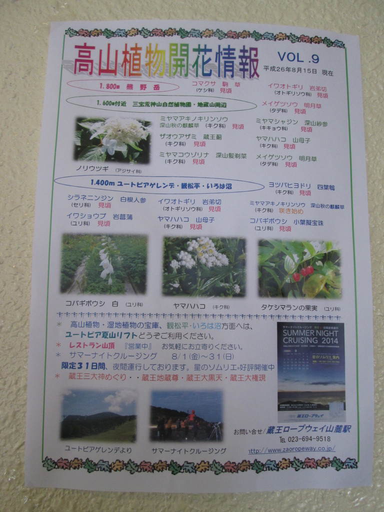 昨日蔵王ロープウェイ山麓駅から高山植物開花情報Vol9・8月15日号が届きました。熊野岳にはまだ高山植物の女王「蔵王こまくさ」が見頃のようです。ロープウェイスタッフにどこで開花しているか問合せし観賞して下さい。ポスターに掲載されているようにまだ高山植物沢山ご覧いただけます。