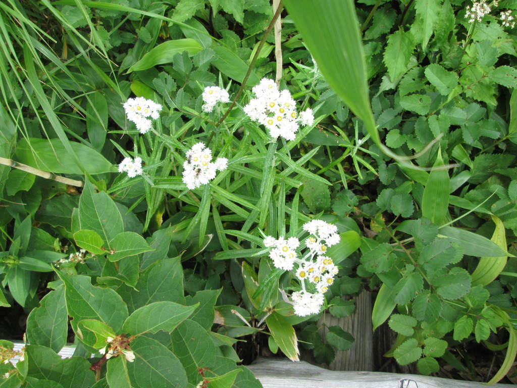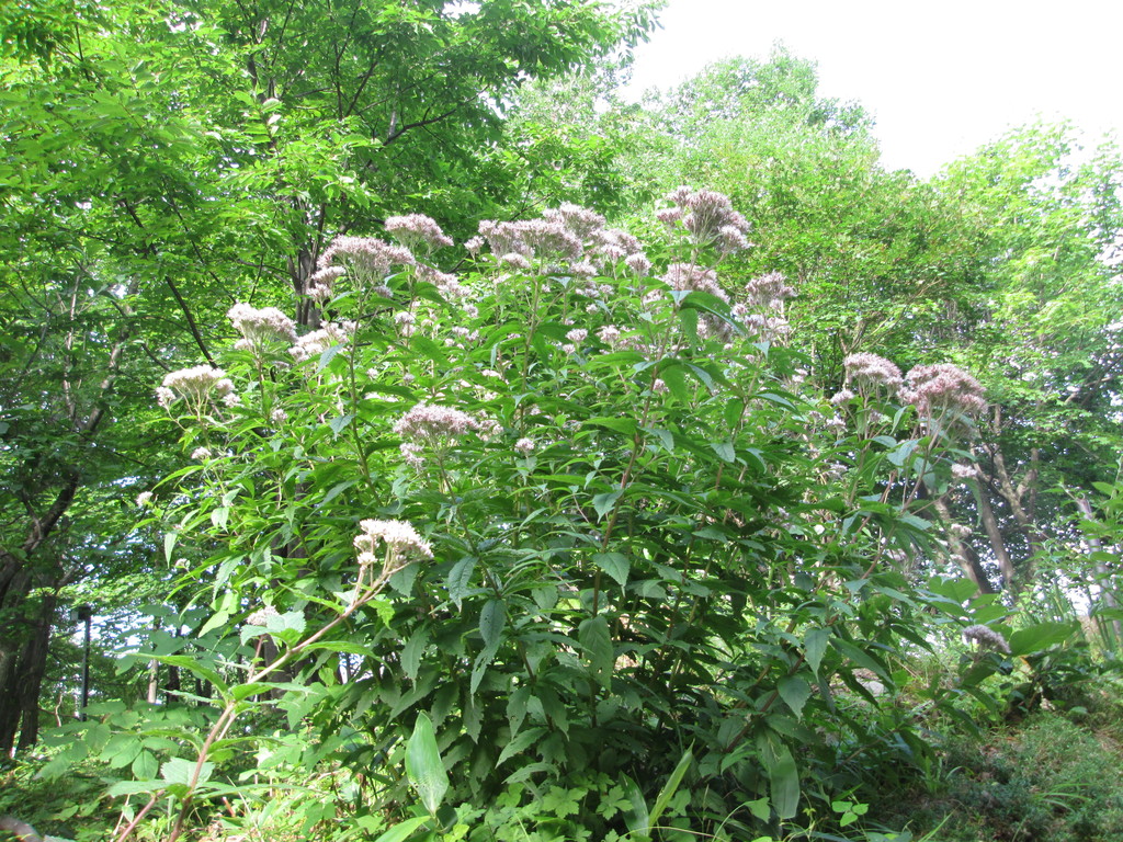 ル・ベール蔵王玄関前。朝7時・18度・雨模様・お山は雲の中・無風・昨日蔵王ロープウェイ山麓駅から高山植物開花情報VOL10号が届きました。内玄関に掲示しました、アサギマダラがヨツバヒヨドリに飛んできている写真が掲載されています