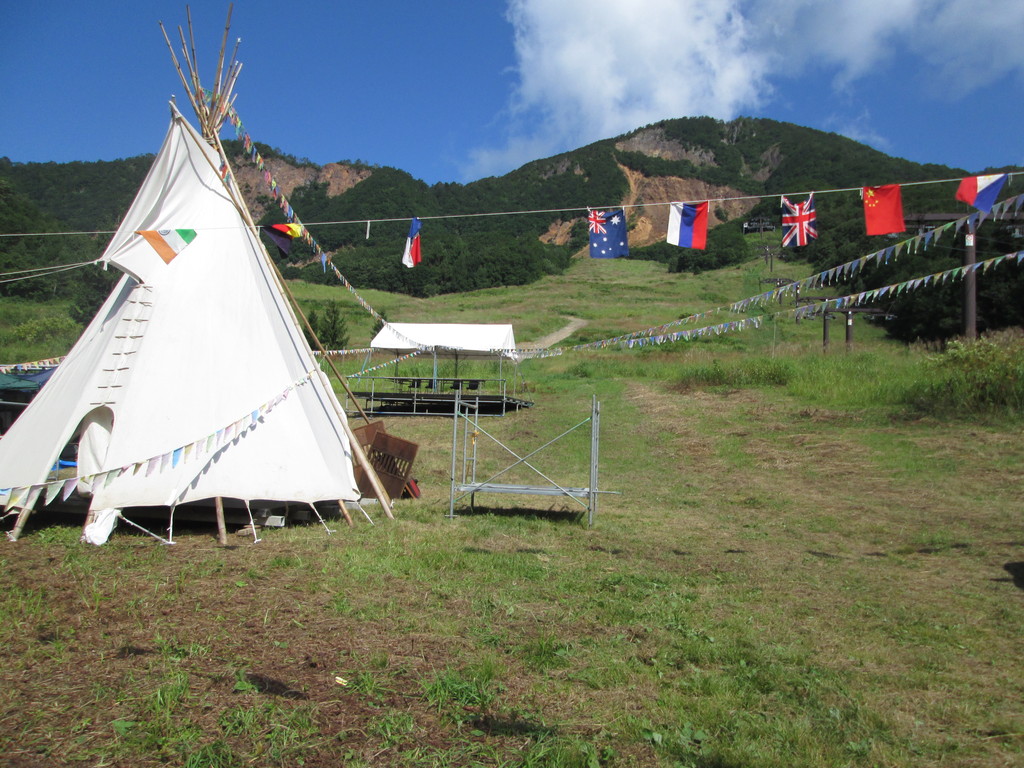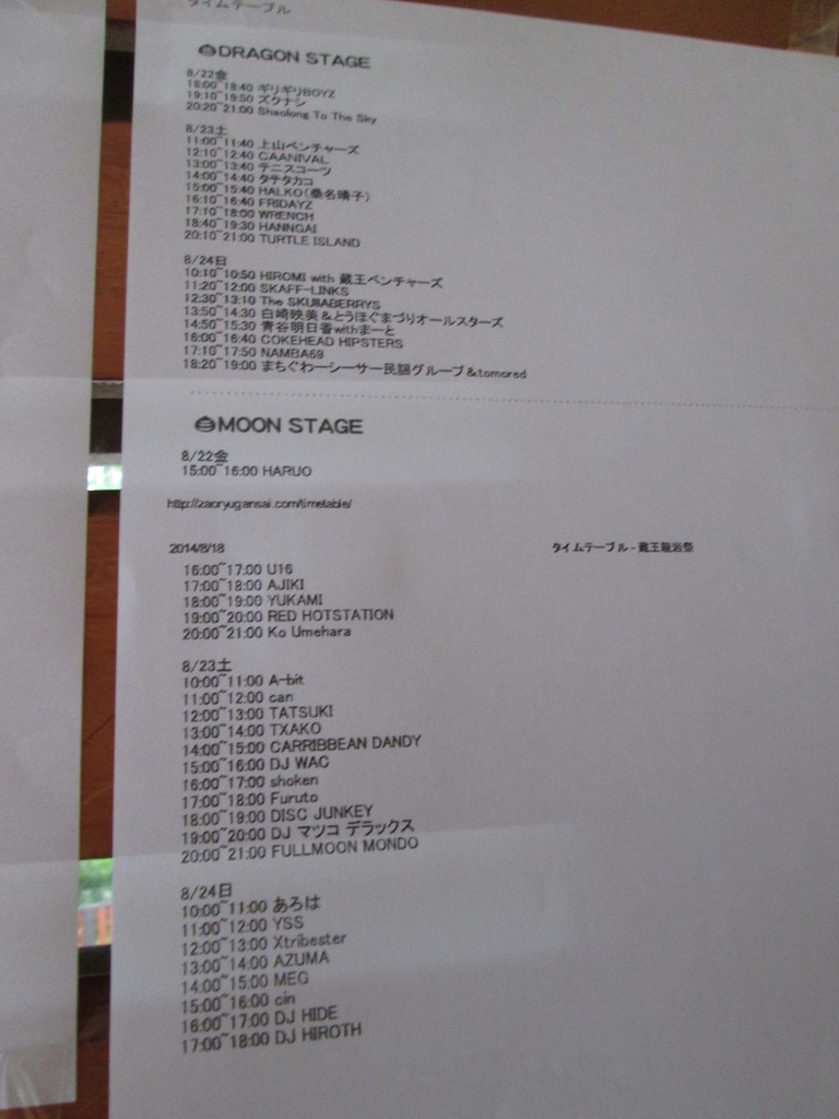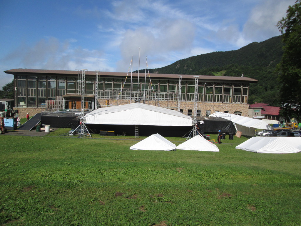 ル・ベール蔵王玄関前・朝7時・21度・晴・陽がさしています。蔵王の若者が手造りの音楽祭龍岩祭2014始まります、昨日タイムスケジュールが更新されました。DRAGON STAGE 20・MOON STAGE 26・みちのく堂30(内9飛び入り枠何が演奏されるか???)・439ラウンジ25合計100を超えるアーチストが演奏します。飲食店・若者向けグッツ店他若者向けお店がオープンします。DORAGON STAGEの電源太陽パネル200枚以上上ノ台ゲレンデに設置されまかないます。