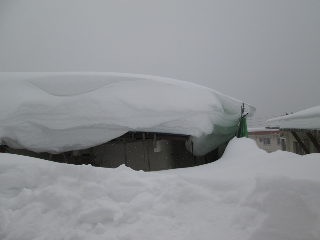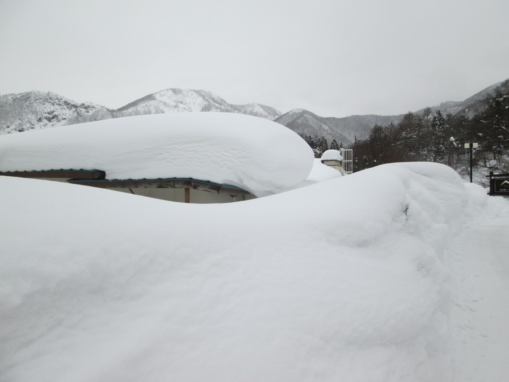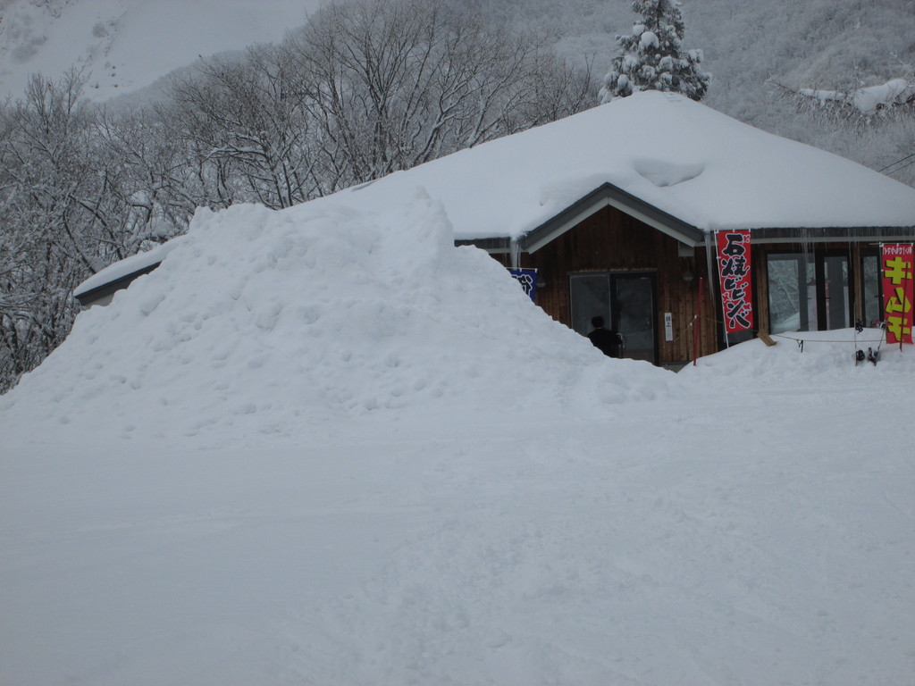 入口右側の荘内銀行蔵王山荘今日から2日間地元大手建設業者が雪降ろしに来ます、人の身長以上積もり屋根が一部壊れているようです、除雪されれば損壊状態が見えると思われます!!!