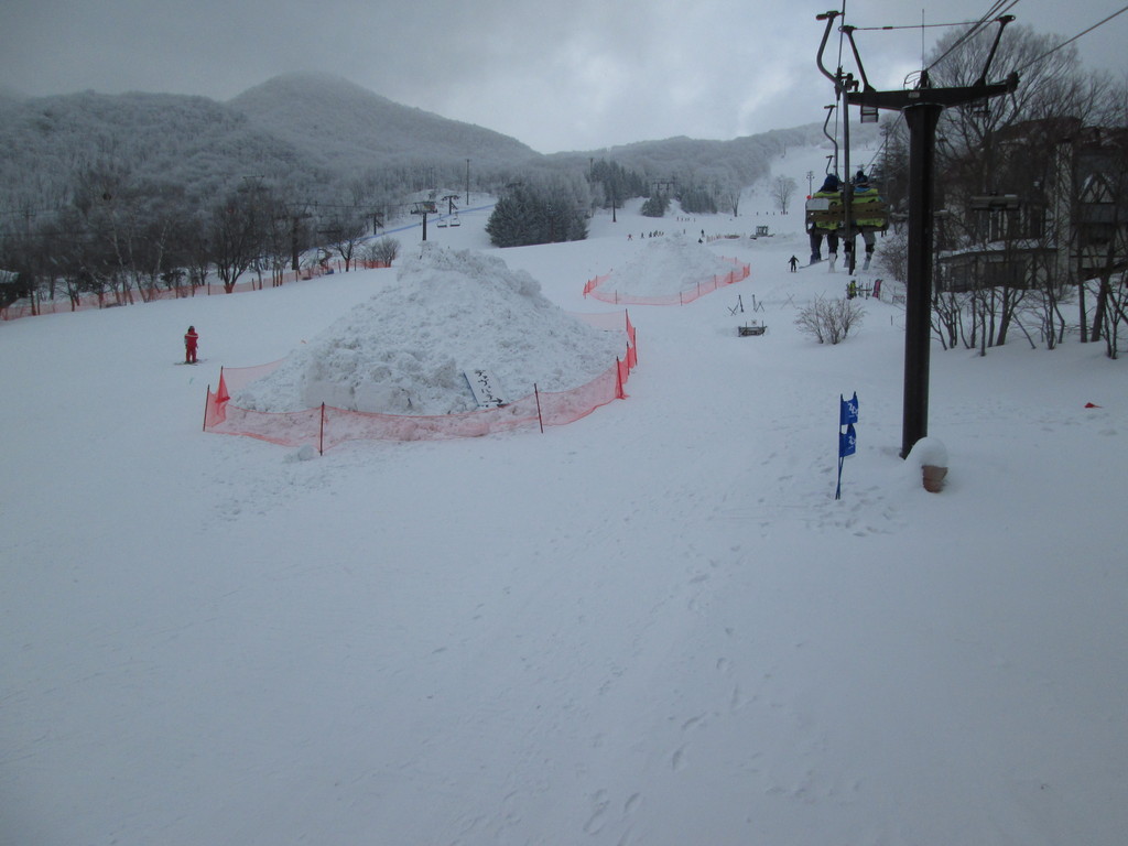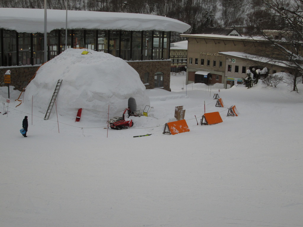 ル・ベール蔵王玄関前・朝7時・−4度・曇・無風・昨日標高1,200m以下はアイスバーン・それ以上はパウダースノーでした!!!一部のゲレンデはピステン玉が出来ていて滑り難い圧雪でした、今日も同じ状態ですので1,200m以下のゲレンデ注意してお滑り下さい!!!写真は明日の第50回雪と炎の饗宴で華麗なジャンプをするジャンプ台です!!!