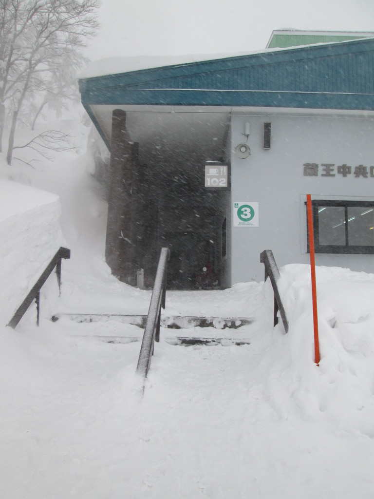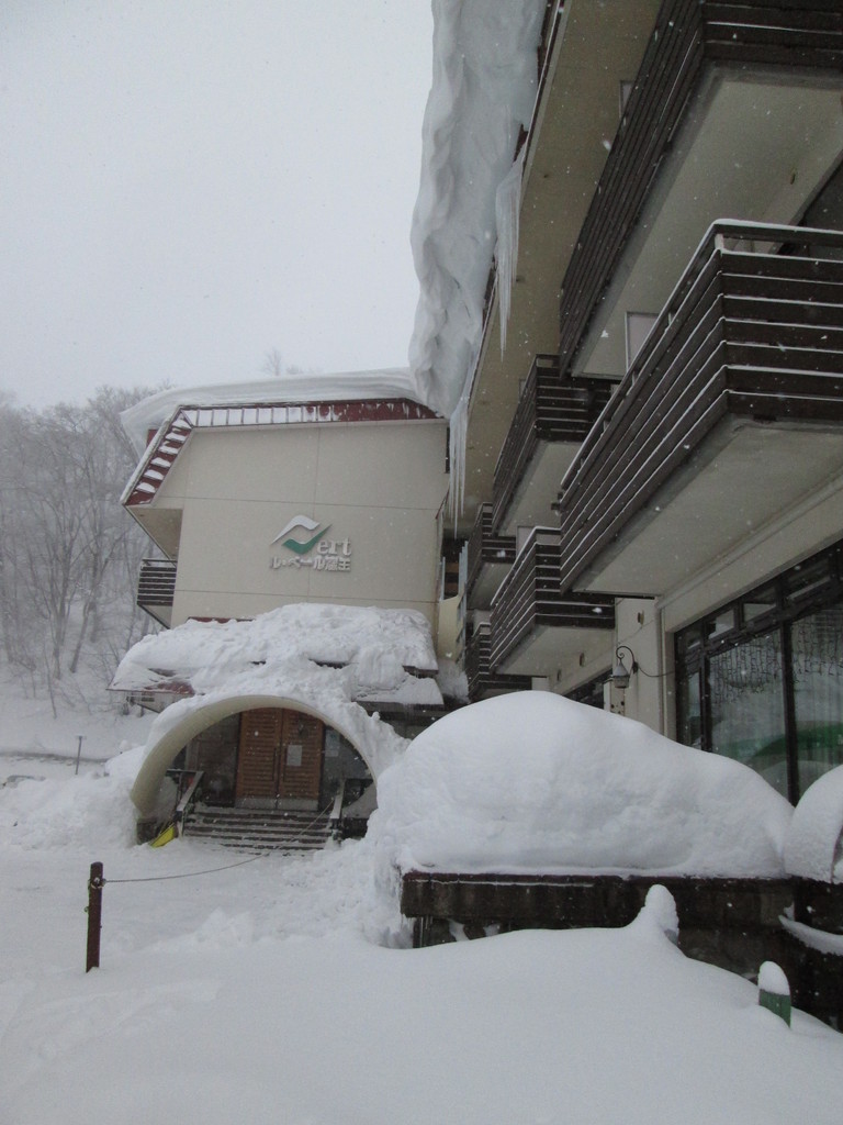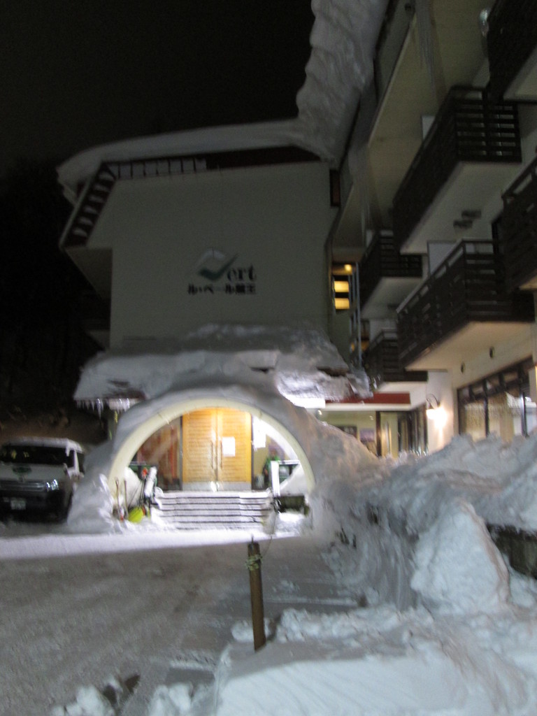 ル・ベール蔵王玄関前・朝7時・−5度・晴・無風・陽がさして視界良好・バーンアイスバーンです・スピードを制御してお滑り下さい。写真はやっと除雪に総勢9名で来た入口手前の蔵王山荘です、多い所は3m以上積もったようです???