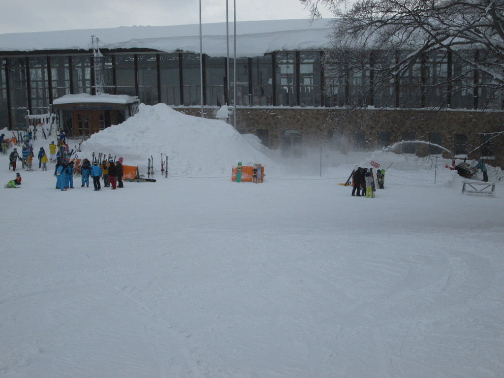 ル・ベール蔵王玄関前・朝7時・−5度・小雪・新雪10cm・視界良好。サンライズバレー競技スキー選手の練習でGS・Sの旗門が立てられていまいした。