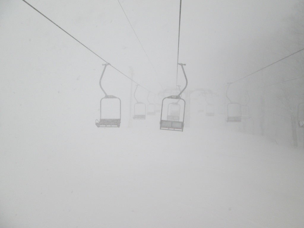 ル・ベール蔵王玄関前・朝7時・−3度・曇・新雪2cm・視界良好、昨日朝一番の蔵王中央ロープウェイ8時15分で鳥兜ゲレンデで30cm以上の新雪とー11度・風速20m・体感温度−30度の世界で滑って来ました。写真は吹雪と新雪20cm・視界不良の中森ゲレンデです。