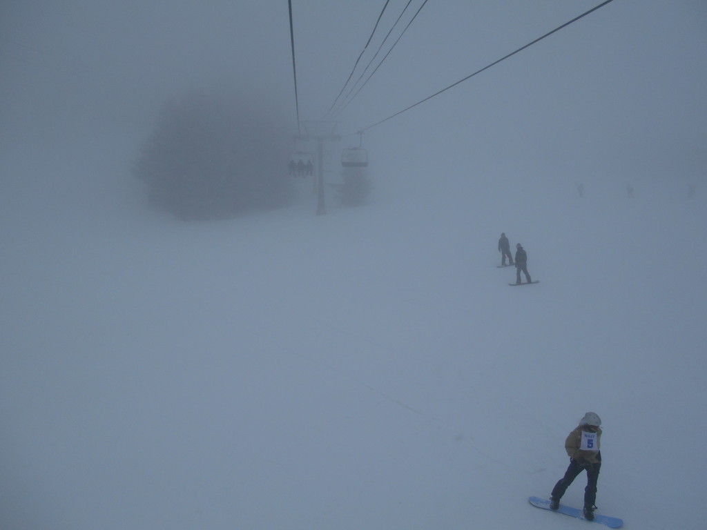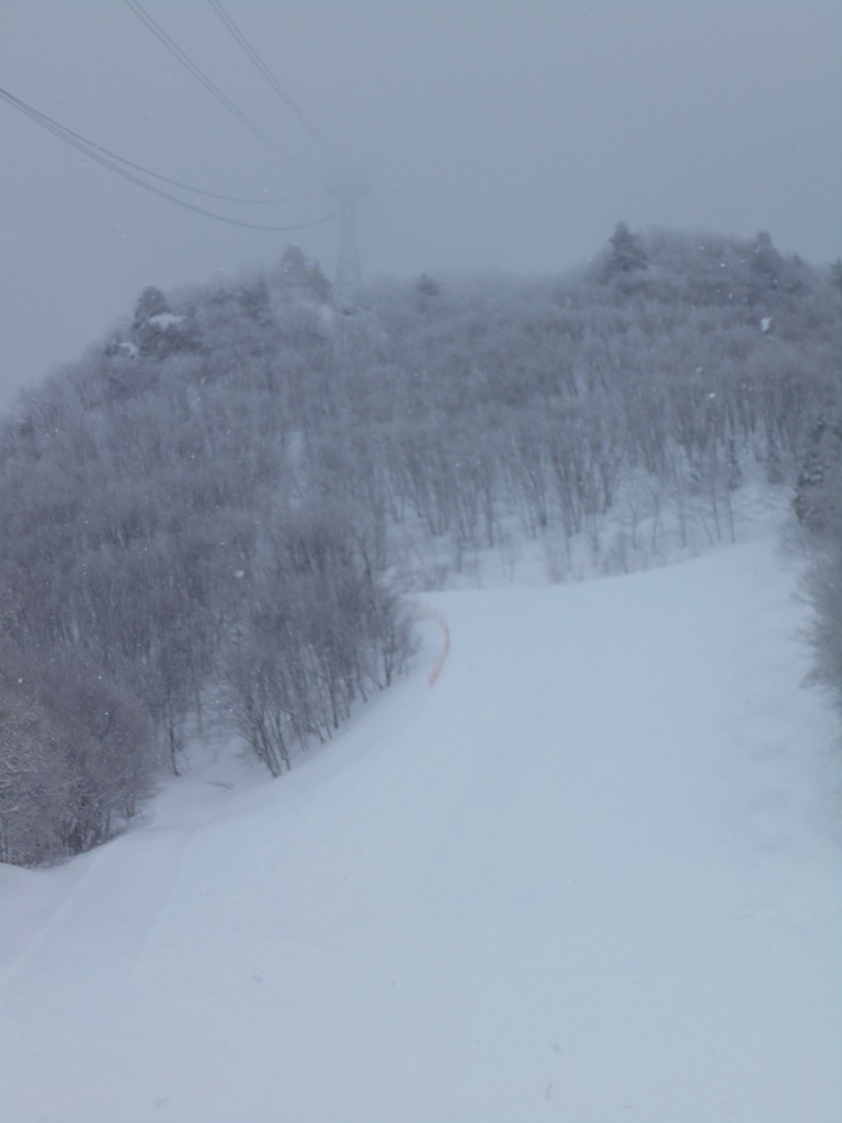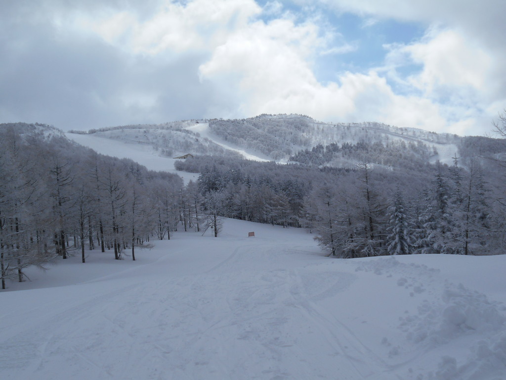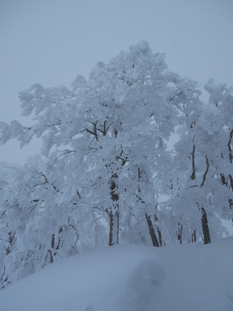 周りのブナ林が霧氷になった中森ゲレンデ斜度25度のスロープです、右端にモーグル凸凹のコースが出来ています!!!