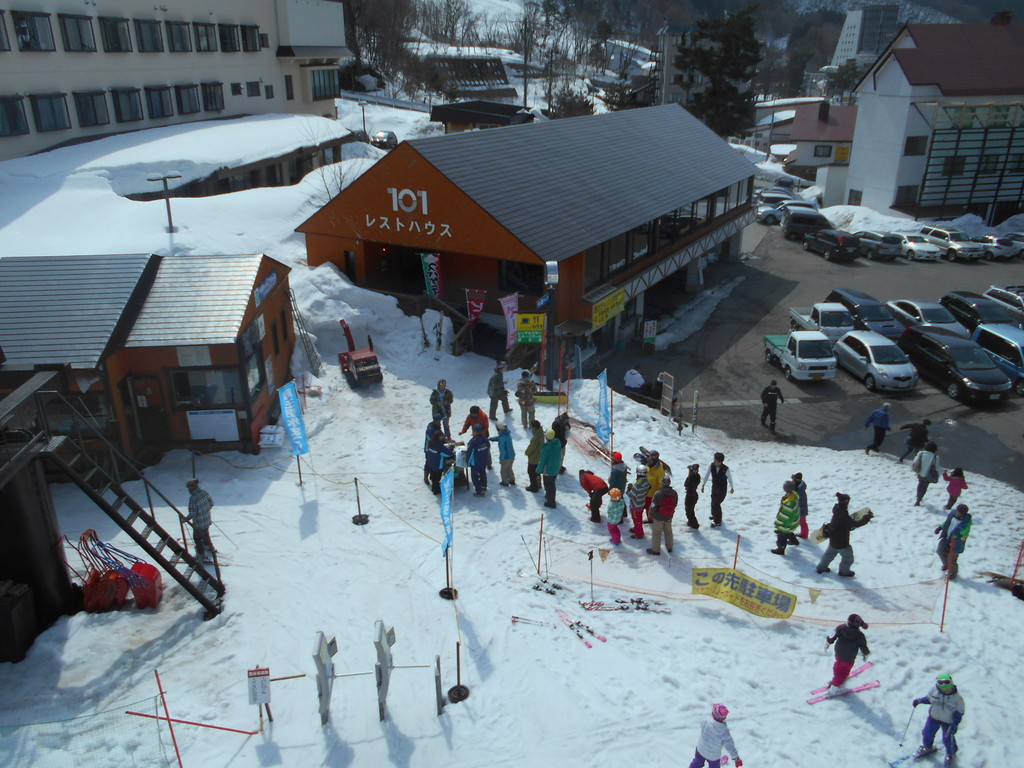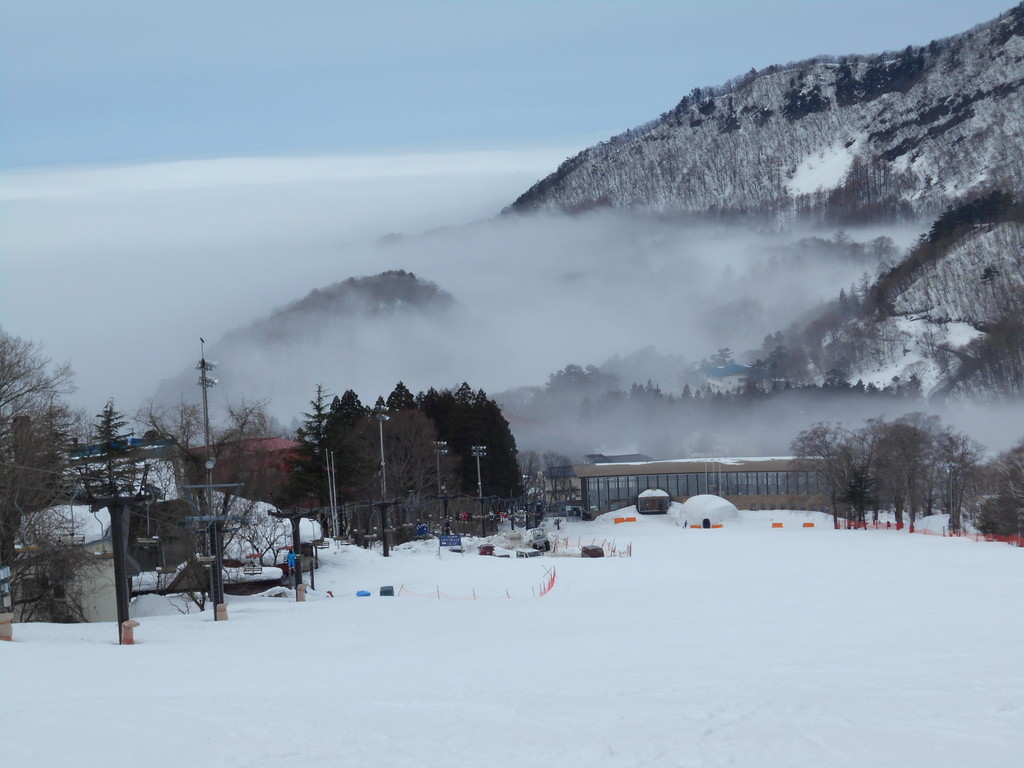 ル・ベール蔵王玄関前・朝7時・0度・晴・無風・視界良好・ザラメのバーンで高速回転がお楽しみいただけます。ハーネンカムで約200名弱の選手が集い戦前から行われている伝統の蔵王スキー大会が朝から行われます。写真は鳥兜山から写した下界は雲の下でした。