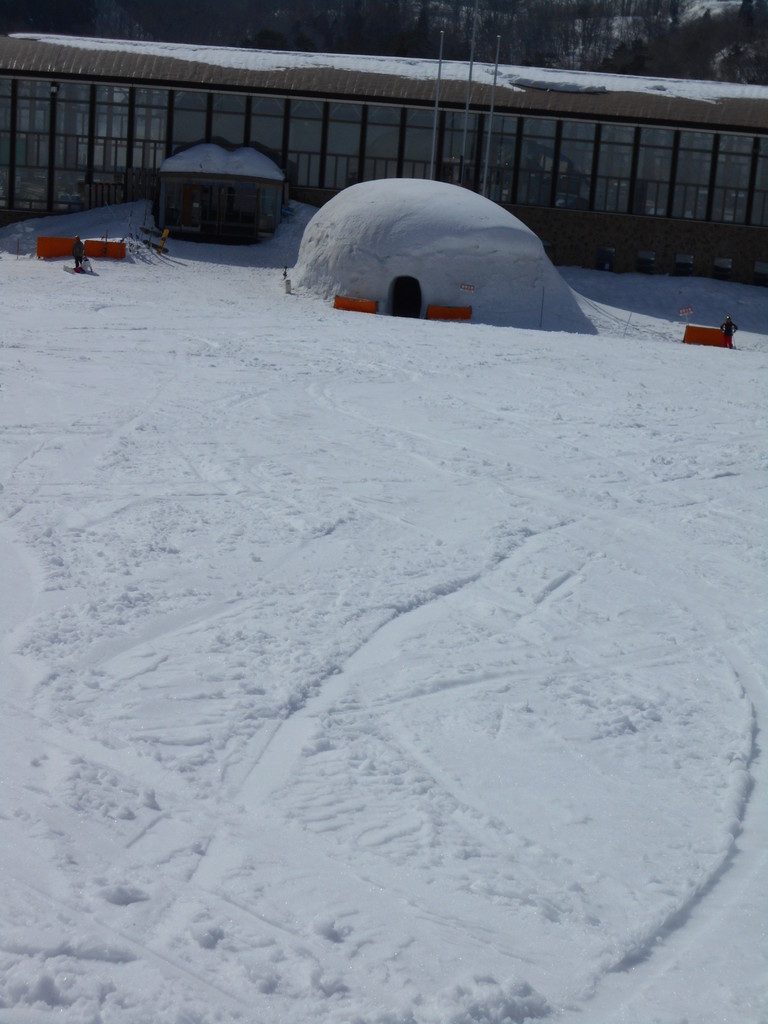 ル・ベール蔵王玄関前・朝7時・4度・晴・青空・雪焼け止めが必携・無風・昨日午後標高1,100m以下3月の雪質でした、今日は下界18度と暖かくなるので更にベトベトに鳴る様です。トニーザイラー顕彰碑とトニーザイラーコースです、カラサワの30度の壁滑る人が少なくフラットで硬いしっかりしたバーンです。