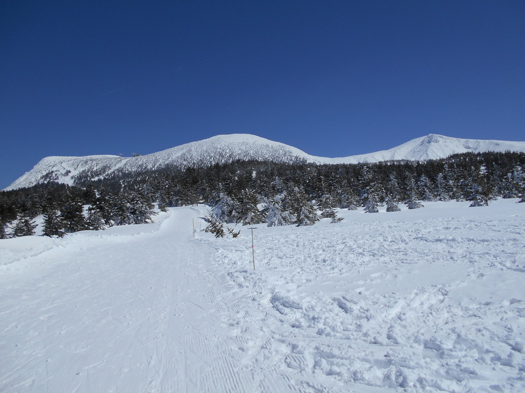 ル・ベール蔵王玄関前・朝7時・2度・晴・陽がサンサン雪焼け止めが必携・無風・昨日標高1.380mコタンゲレンデにも樹氷が出来・樹氷原コース55番標識奥からの三宝荒神山・地蔵山・熊野岳撮影スポット前のアオモリトドマツも樹氷になっていました!!!